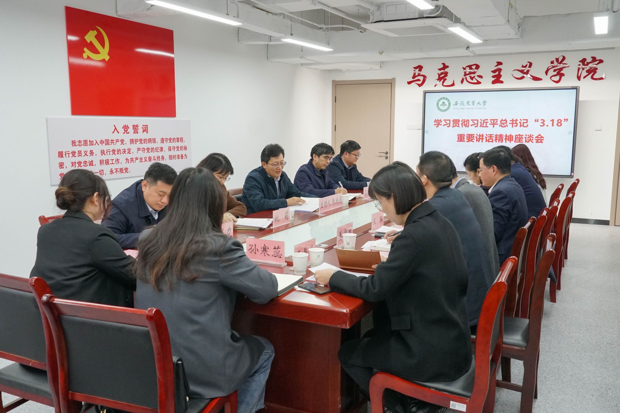 本网讯 3月13日下午,校党委书记张庆亮主持召开座谈会,重温习近平总书记“3.18”重要讲话精神,共同研究加强思政课建设,全面推动学校思想政治工作高质量发展。校直相关部门负责人,马克思主义学院领导班子、师生代表参加会议。