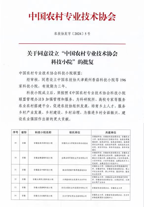 本网讯 近日,中国农技协下发了《关于同意设立“中国农村专业技术协会科技小院”的批复》,我校安徽临泉芥菜科技小院、安徽金寨蜜蜂科技小院、安徽歙县中蜂科技小院、安徽太湖翠玉梨科技小院、安徽大观番鸭科技小院、安徽无为白鹅科技小院等6个科技小院获立项支持。