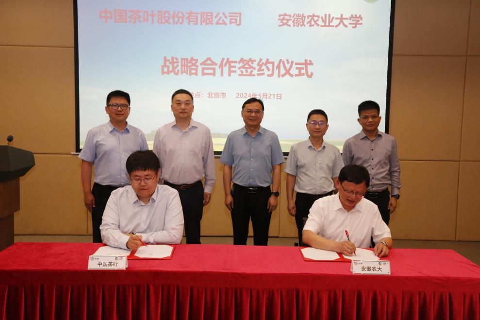本网讯 2024年5月21日,值国际茶日之际,安徽农业大学与中国茶叶股份有限公司战略框架合作协议签约仪式在北京举行。校党委常委、副校长操海群,中国茶叶股份有限公司党委书记、总经理沈芃出席签约仪式。签约仪式由中茶科技总经理李颂主持。
