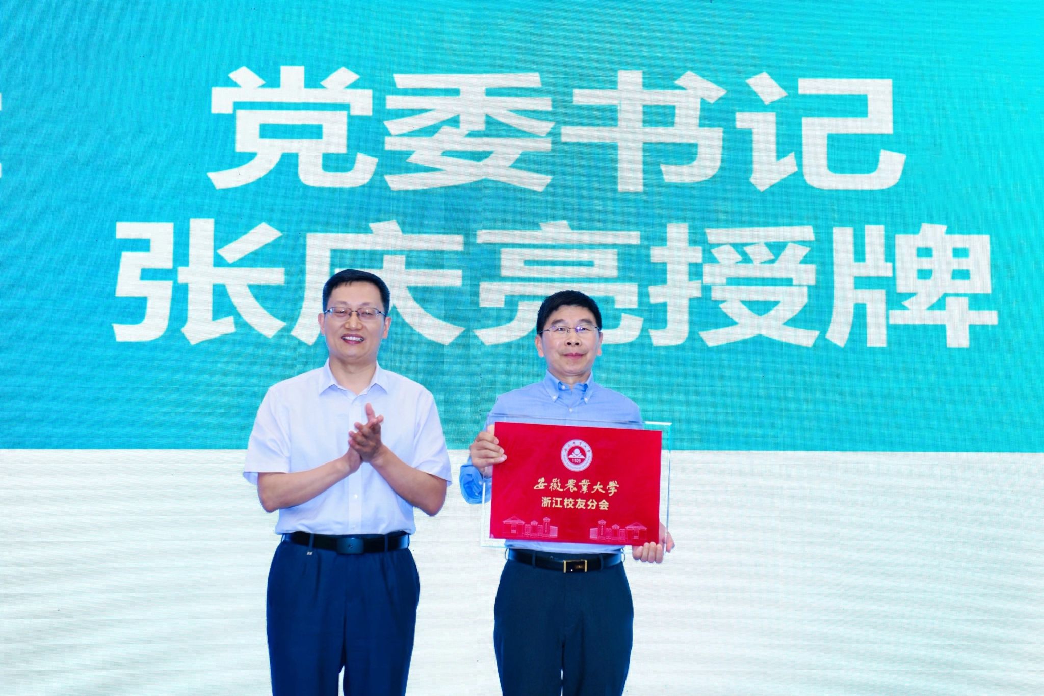 选举结束后,张庆亮为浙江校友分会授牌。蔡德军、裴树东为当选首届理事会负责人颁发聘书。