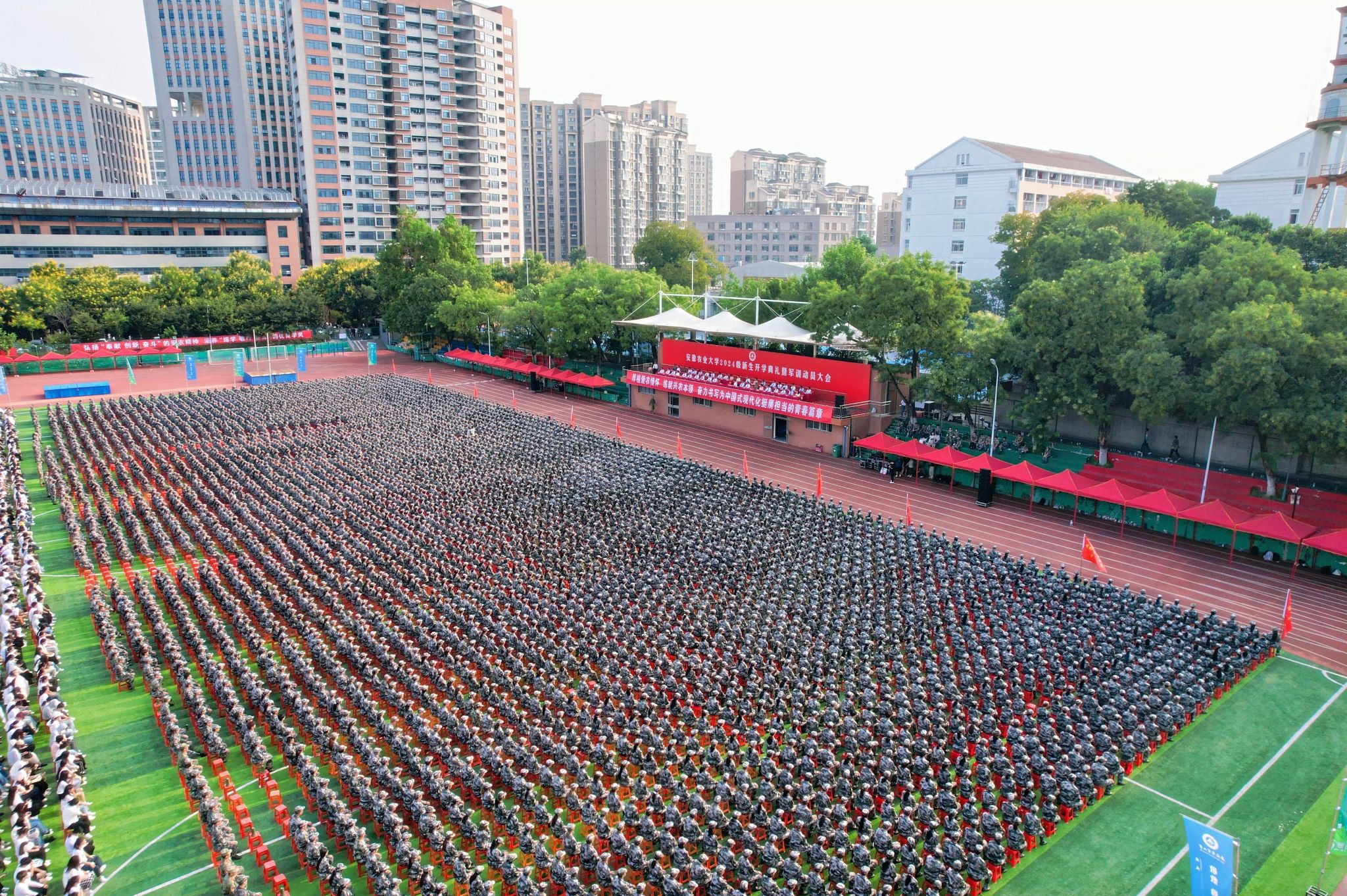 本网讯 9月4日上午,我校在田径运动场举行2024级新生开学典礼暨军训动员大会。校领导张庆亮、李红、陈文兵、操海群、吴祥为、蔡德军、吴文革,承训单位领导出席会议。大会由校党委常委、副校长李红主持。相关部门主要负责同志,各学院党政主要负责人,新生辅导员以及2024级全体新生参加大会。
