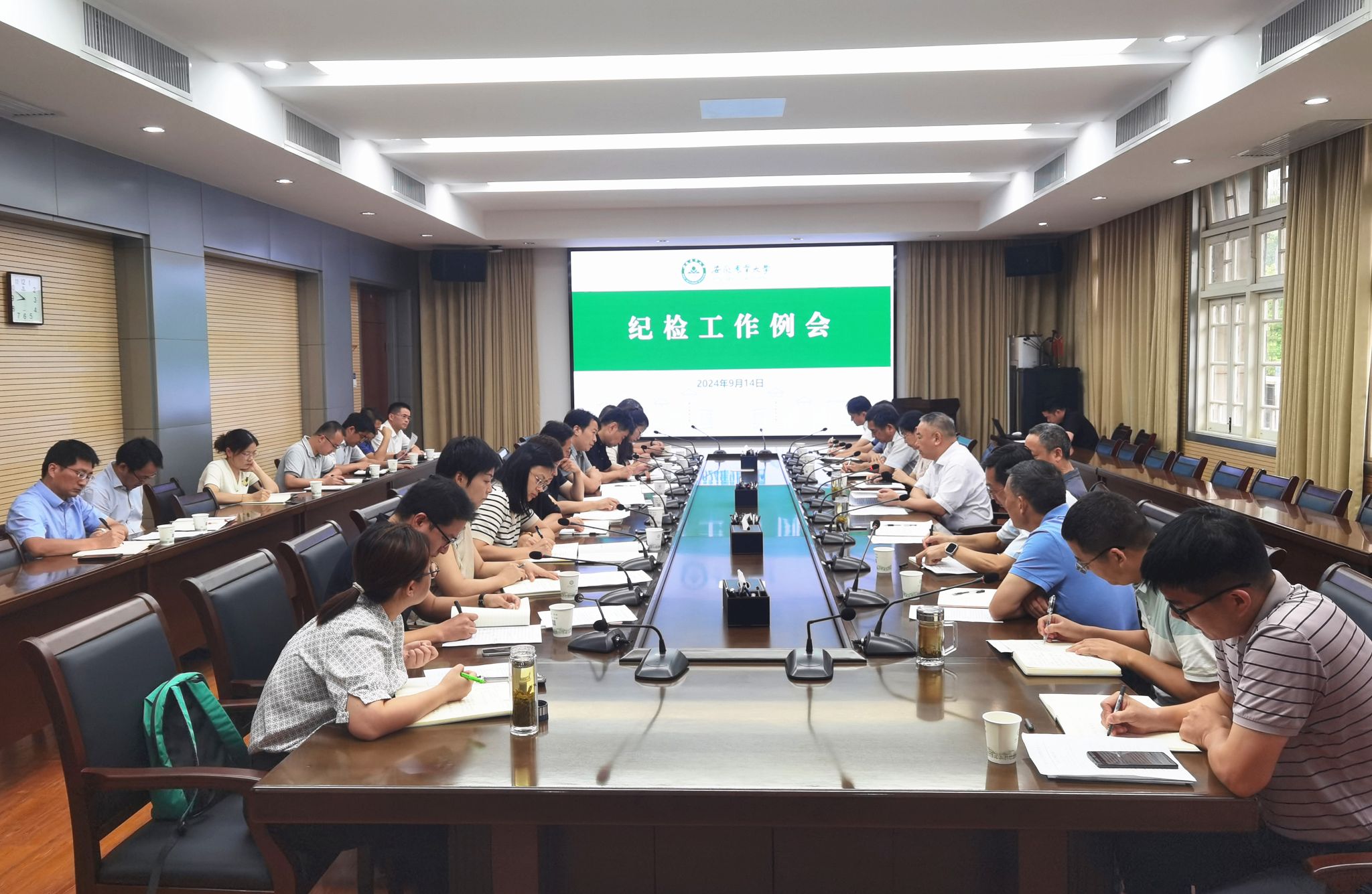 本网讯 9月14日上午,校党委常委、纪委书记、监察专员陈文兵主持召开学校纪检工作例会,围绕2024年“一校一策”选题“提升纪检监察干部斗争本领 深化解决‘不敢不愿不会’监督问题”,对专兼职纪检监察干部开展专题培训。