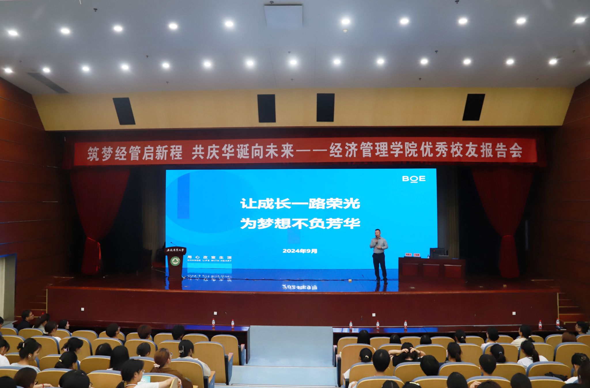 本网讯 9月24日晚,校友会办公室联合经济管理学院于图书馆一号报告厅举办“筑梦经管启新程,共庆华诞向未来”优秀校友专题报告会,邀请2007届公共事业管理专业优秀毕业生、京东方科技集团合肥区域党委书记、总经理丁光辉回校作专题报告。报告会由经济管理学院党委书记武晓蓓主持,400余名师生参加了报告会。