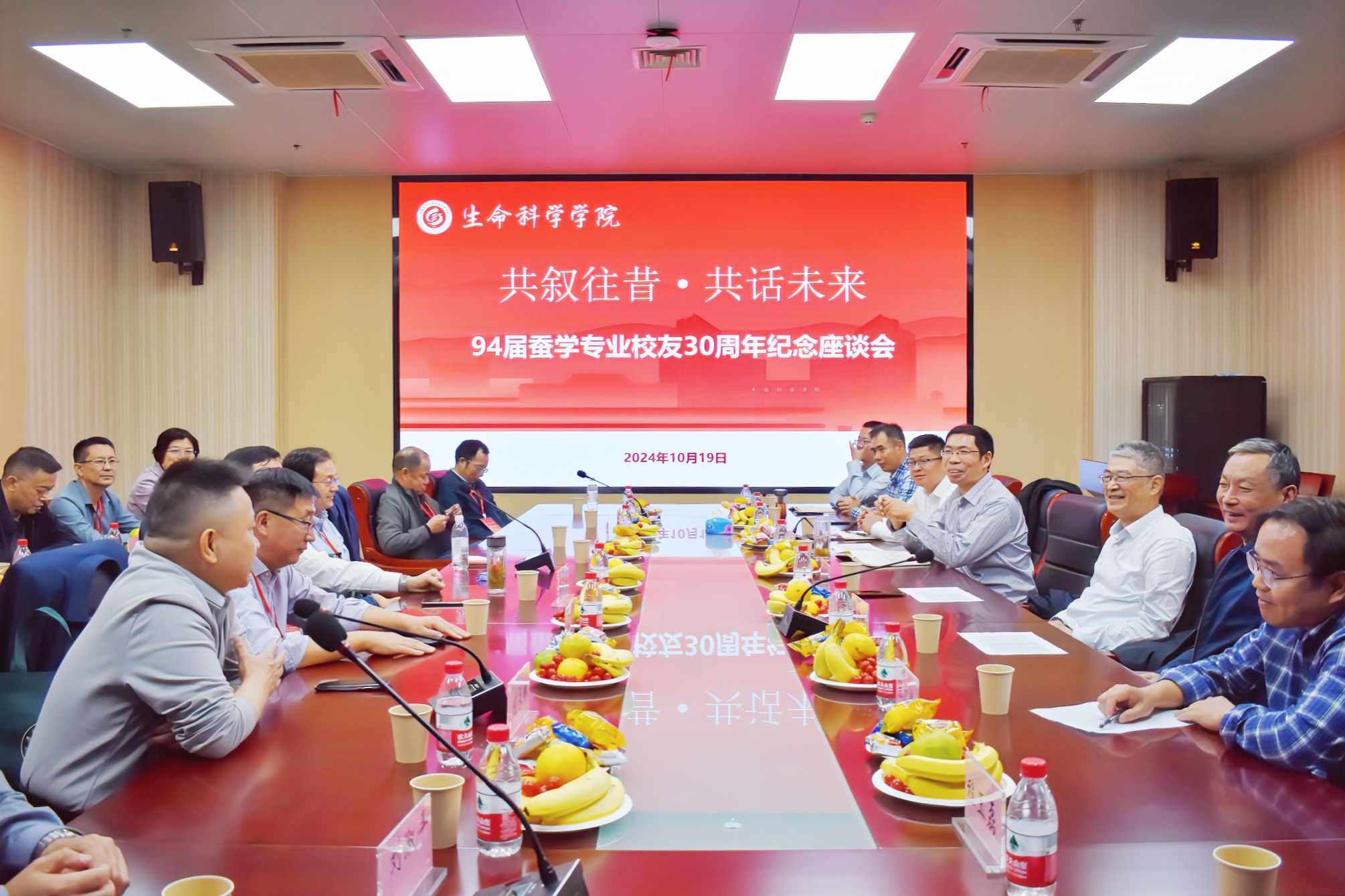 本网讯 “忆当年,书山觅径,学海泛舟;看今朝,初心未改,少年依旧!” 10月19日,生命科学学院1994届蚕学专业毕业30周年、2004届生物技术专业毕业20周年返校聚会在生物科技楼B420会议室举行。1994届蚕学专业辅导员阮爱民、教师代表甘传鹤、2004届生物技术专业辅导员王云生、赵海泉、学院班子成员、1994届及2004届校友代表等参会。