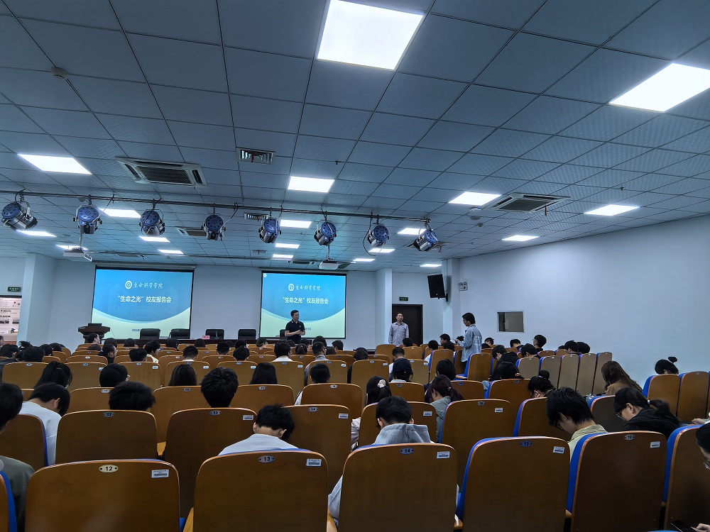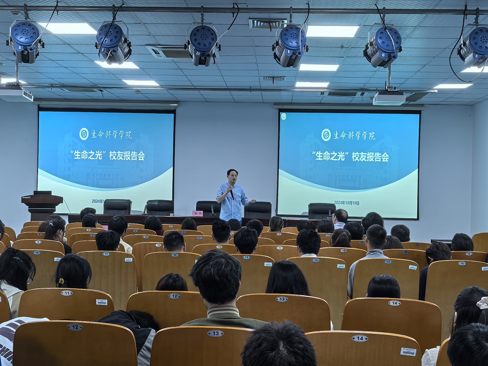 本网讯 10月19日上午,生命科学学院在生物科技楼B438报告厅举办“生科之光”优秀校友报告会。两位2004届生物技术专业优秀毕业生,希肯生物技术(苏州)有限公司总经理杨科和安徽国科检测科技有限公司副总经理高柱,为全体2024级学生作报告,报告会由学院党委书记曹雷主持。
