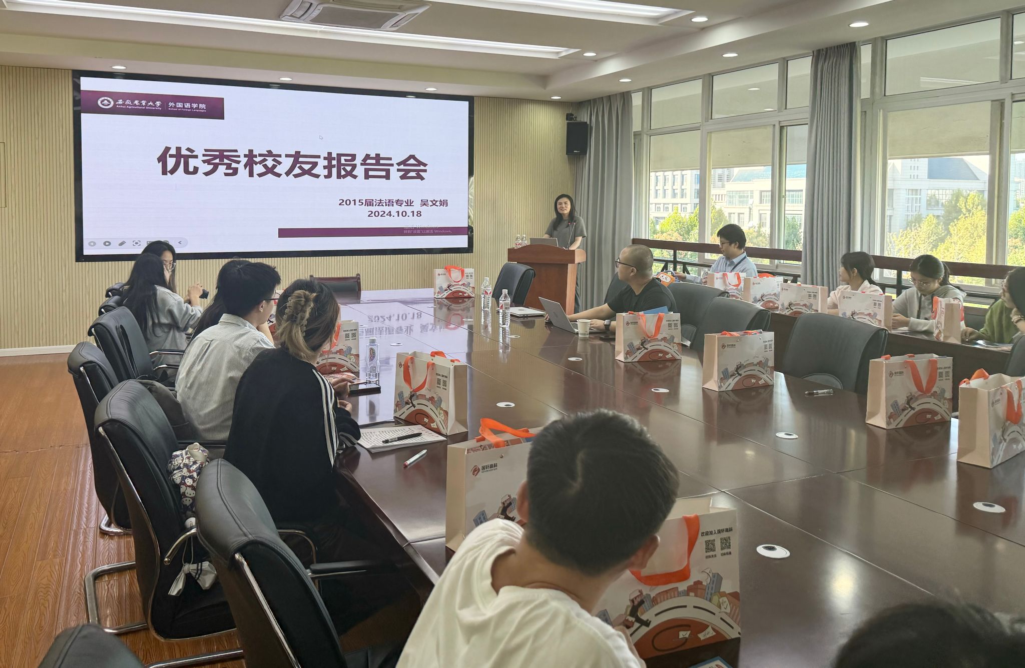 本网讯 10月18日下午,外国语学院在外语楼506会议室举办优秀校友报告会暨校友企业专场宣讲会,合肥国轩高科动力能源有限公司欧非业务板块产品中心高级经理吴文娟(2015届法语专业校友)、工研总院人力资源部副经理夏胜春、工研总院人力资源部HR陶祥胜、外国语学院党委副书记姬惠惠、2025届部分毕业生等参加了会议。