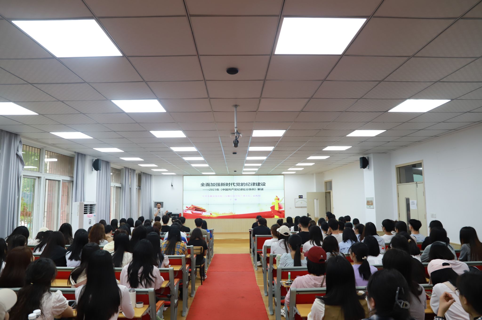 本网讯 为贯彻落实党纪学习教育和2024届毕业生党员教育管理工作要求,切实做好党员思想政治教育工作,激励党员牢记初心使命,做到学纪、知纪、明纪、守纪。6月5日下午,经济管理学院在经管楼103报告厅开办经管初心讲堂,邀请05届农村区域发展专业校友、中共安徽省委党校(安徽行政学院)于徳副教授作党纪学习教育专题报告。学院党支部书记、新发展党员、毕业生党员参加了本次报告会。会议由学院党委副书记、纪委书记周涛主持。