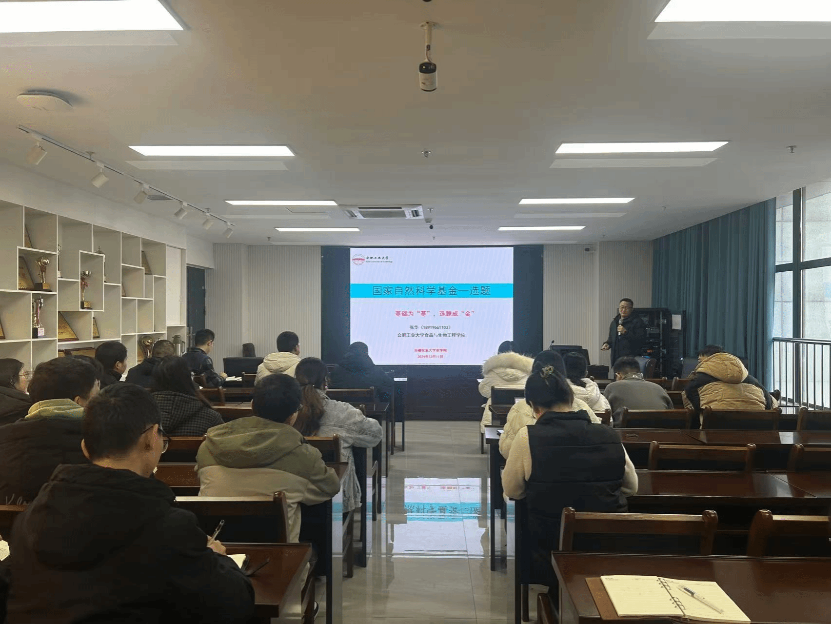 本网讯 12月11日,安徽农业大学农学院在朝阳楼202举行国家自然科学基金申报辅导报告会,特邀合肥工业大学博士生导师张华教授做辅导报告,农学院副院长余恩主持会议。