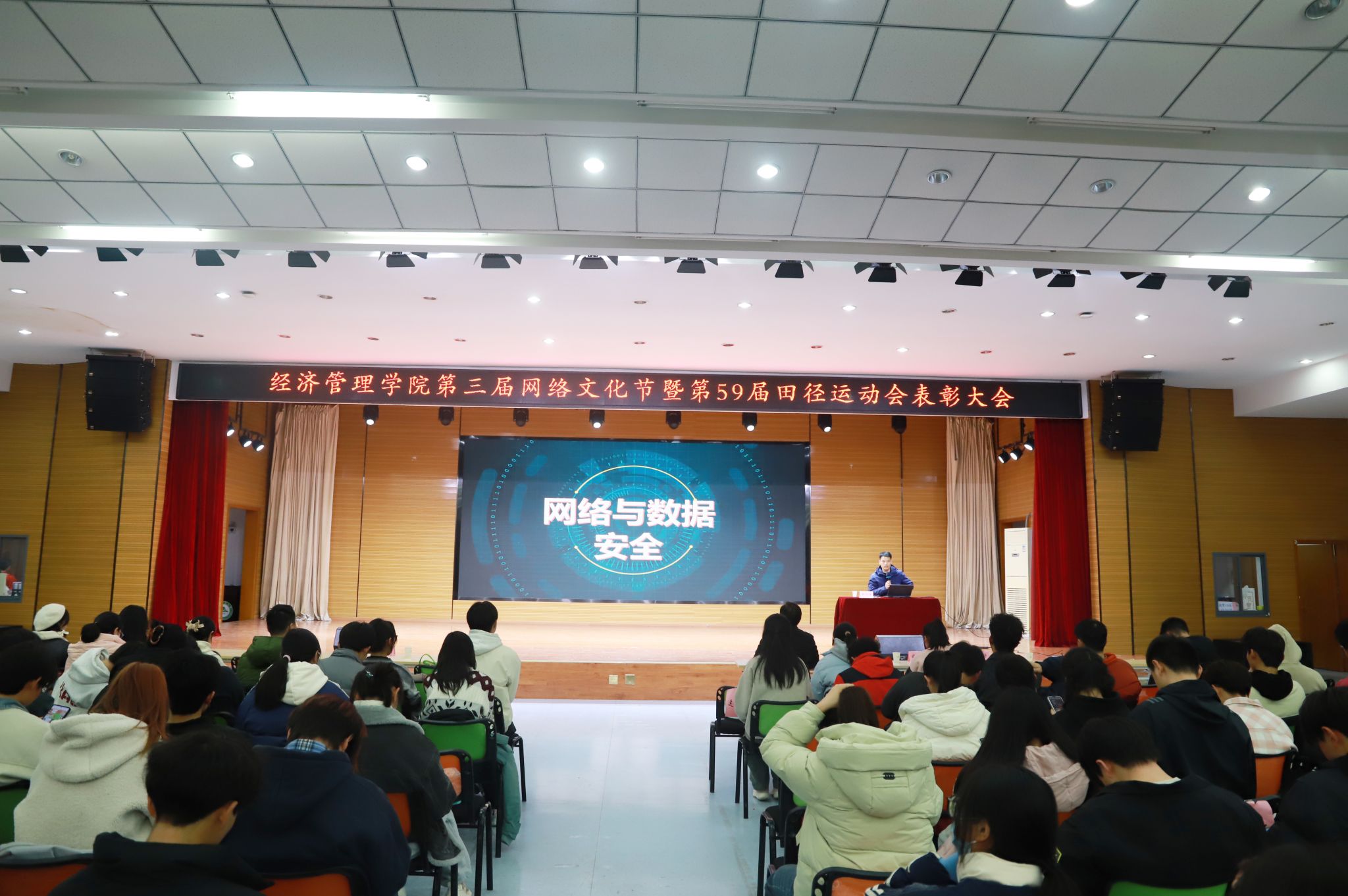一段青春洋溢、热血澎湃的运动会回顾视频拉开了本次表彰大会的序幕。随后,出席本次活动的领导老师为经济管理学院学生田径名人堂成员、杰出运动员、优秀运动员、体育之星获得者75人,第三届网络文化节获奖学生48人以及学院网宣员队伍9人进行了颁奖。颁奖结束后,08届网络工程专业校友朱剑宇为全体参会人员作《网络和数据安全》专题讲座,他从频发的网络安全事件入手,向与会师生介绍了当前面临的网络安全风险,以及网络安全等级保护相关知识,为广大师生上了一堂精彩的网络安全教育课。