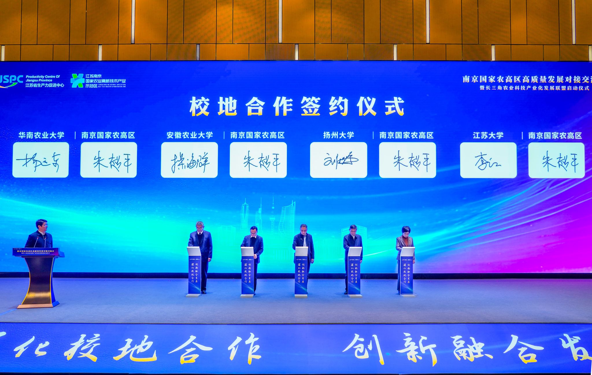 对接会以“深化校地合作 创新融合发展”为主题,启动成立长三角农业科技产业化发展联盟,我校及华南农业大学、扬州大学、江苏大学与南京国家农高区签订校地合作协议,聚焦农业发展和企业需求,共同搭建科技成果转化平台,促进长三角区域农业科技创新和产业创新深度融合。