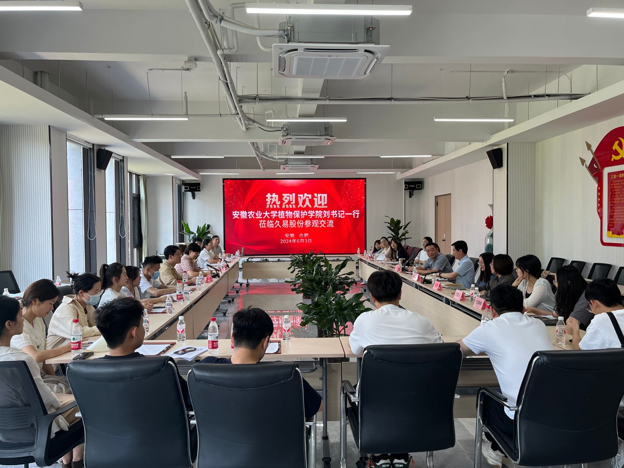 本网讯 6月3日,学院党委书记刘柳一行赴安徽久易农业股份有限公司开展访企拓岗、洽谈产学研合作、看望慰问校友。久易农业股份有限公司董事长、总经理沈运河、营销总监王友定等热情接待了学院一行。