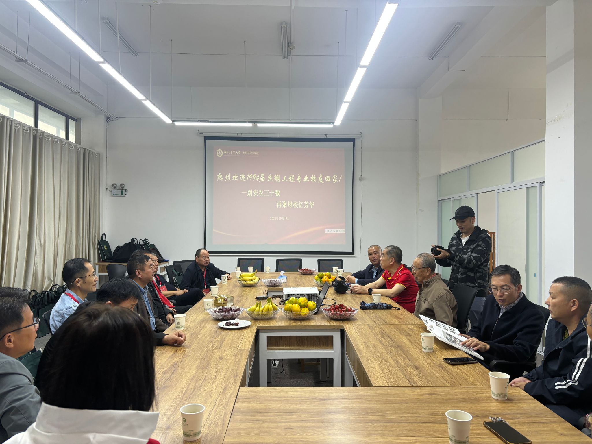 本网讯 10月19日,在庆祝学校建校96周年、在肥办学70周年之际,材料与化学学院1994届校友齐聚一堂,重温青春岁月。丝绸工程的20余位校友在这个特殊的日子里回到了母校,追忆过去、畅谈当下、展望未来。