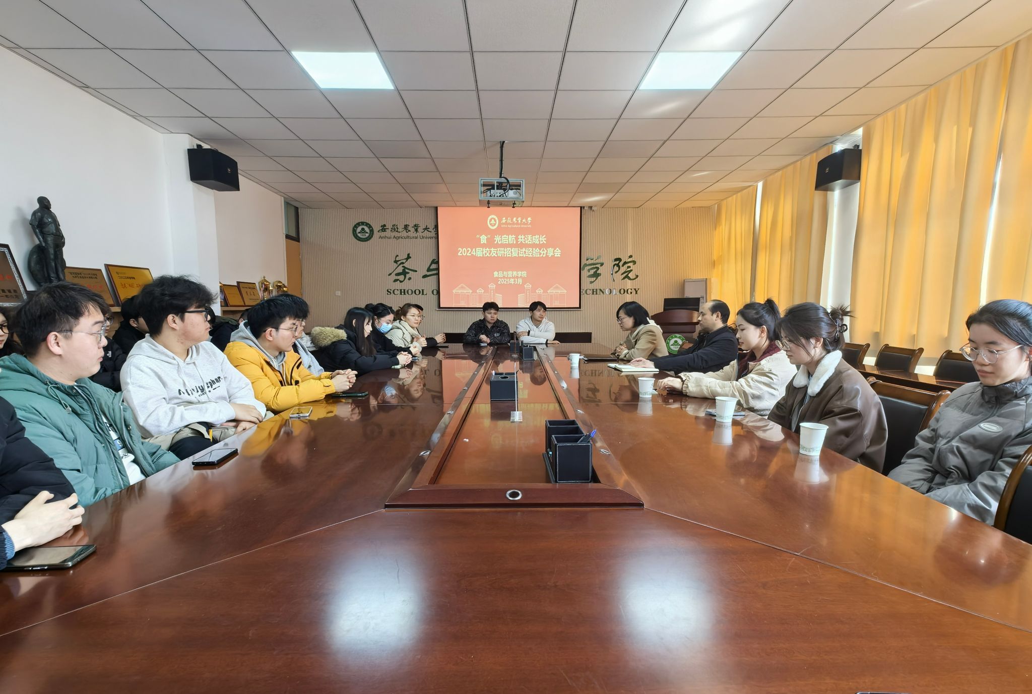 本网讯 3月18日下午,食品与营养学院在茶业楼219室举办了“‘食’光启航,共话成长——2024届校友研招复试经验分享会”。学院党委书记孙福,党委副书记、纪委书记夏晓昀,2024届优秀校友代表、合肥工业大学在读研究生陈俊骊、鲍亚萍、王丽娜,以及部分考研学生代表参加了此次分享会。会议由夏晓昀主持。