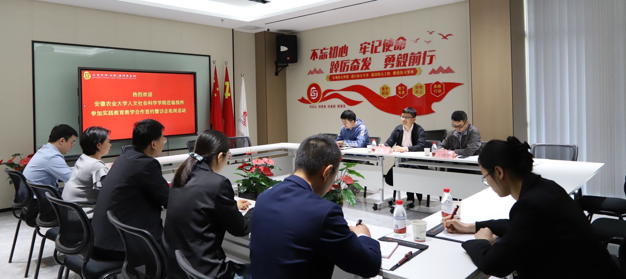 在北京京师(合肥)律师事务所,赵仕龙主任带领学院一行参观了党建文化长廊、会客接待及智慧办公区,重点介绍了律所“党建+律所”的创新发展模式。双方围绕“新文科”背景下法学教育改革、实习实训基地建设、案例教学资源共享等进行探讨。江晓华表示,学院将依托实践育人基地,希望将律所优质实践资源引入课堂教学和科学研究,落实以实践为导向的教育培养机制,培养兼具理论深度与实务能力的法治人才。
