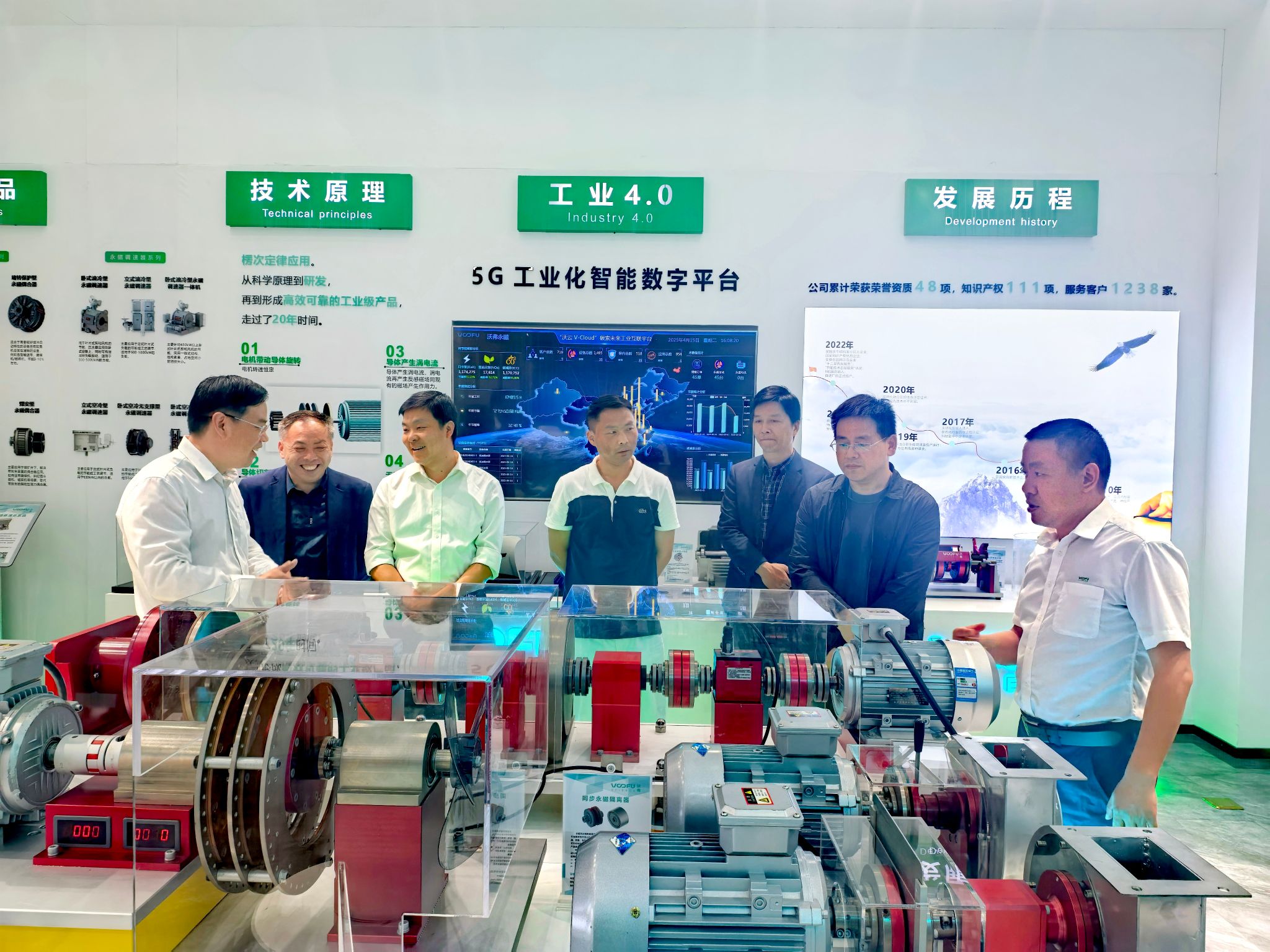 在沃弗永磁科技领导的陪同下,学院一行首先参观了企业展厅,通过图文、视频及实物展品,全面了解企业发展历程、核心技术成果及行业应用案例。作为永磁驱动领域的领军企业,沃弗科技在高效节能传动系统研发方面取得多项国家专利,其产品在石油、化工、电力等领域广泛应用,展现出强大的技术创新实力。