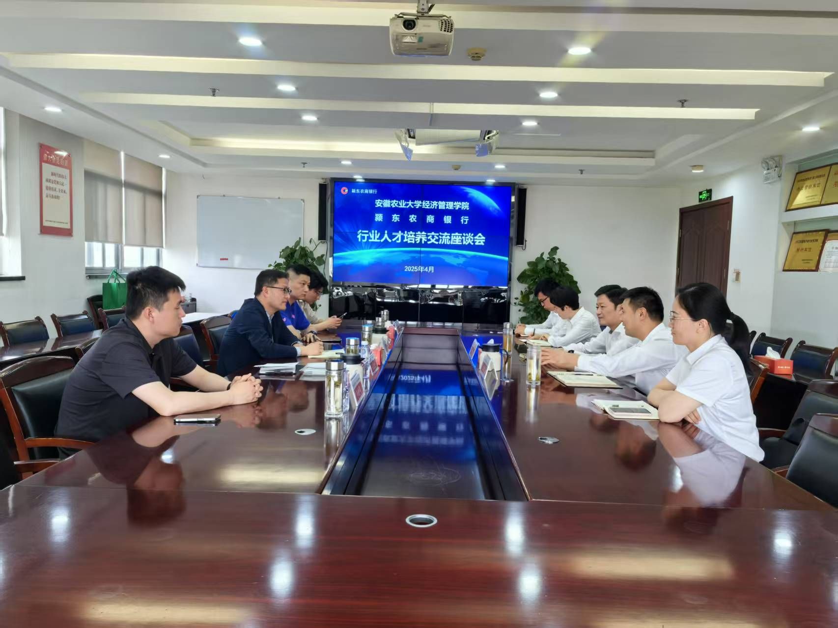 随后,周涛一行来到颍东农商行。座谈会上,1994届农村金融专业校友、颍东农商银行党委副书记、行长方向东介绍了银行的发展现状和未来规划,表达了对金融、经济等专业人才的强烈需求。双方围绕共建实习基地、开展员工培训、合作科研项目等方面进行了探讨。2005届计算机专业校友、副行长王银龙分享了自己的职业发展历程,对学校的培养表示感谢,并为学弟学妹们的职业规划提出了宝贵建议。