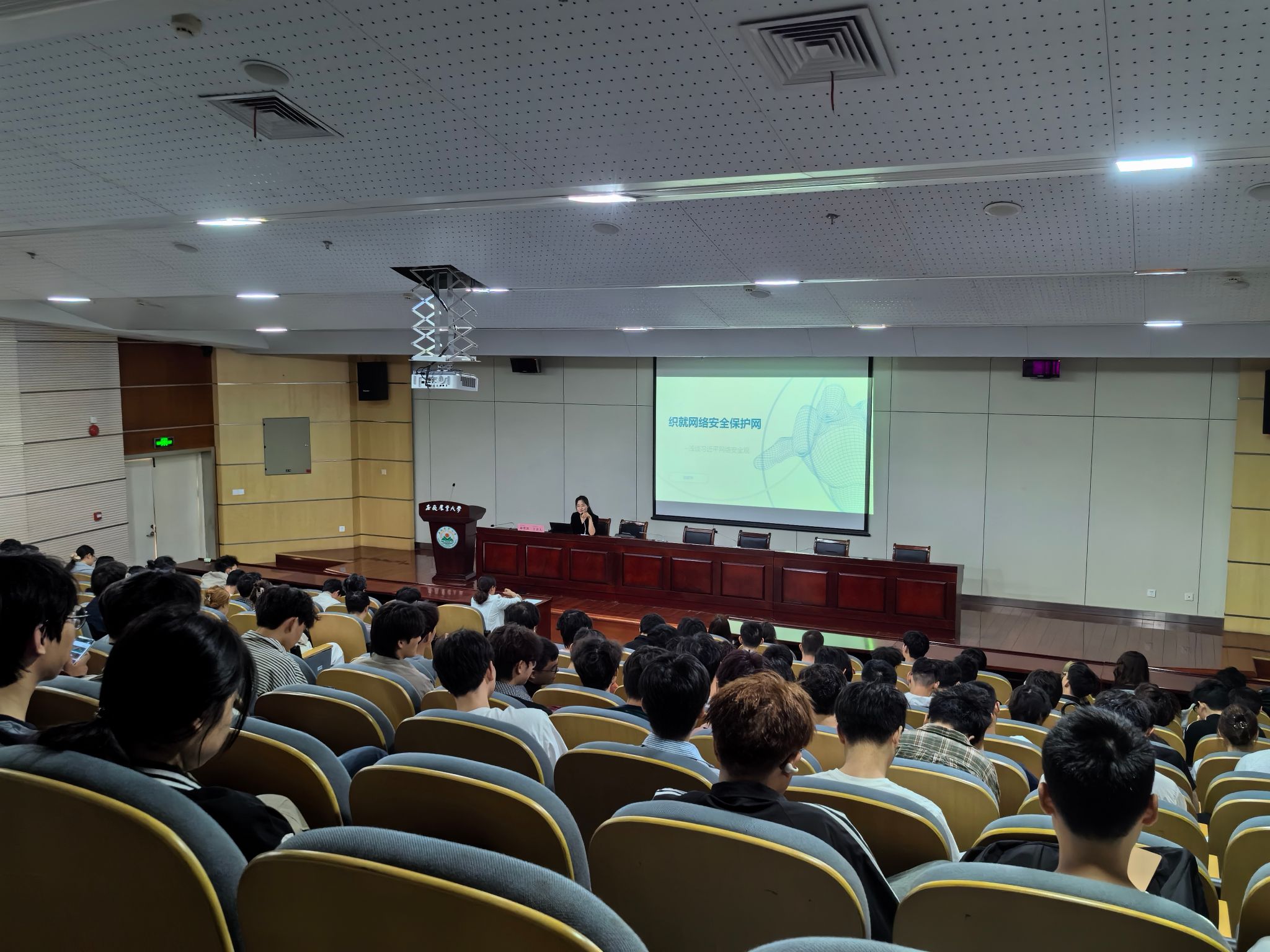 本网讯 为增强学生网络安全意识,深化产教融合育人,激发创新思维,学院于5月9日举办特邀安徽省直机关工委党校讲师、学院2015届通信工程专业校友骆翠萍开展了题为《织就网络安全保护网——浅谈习近平网络安全观》的专题辅导报告。学院22、23、24级网络空间安全专业200余名学生聆听报告。学院党委副书记、纪委书记李南飞主持报告会。