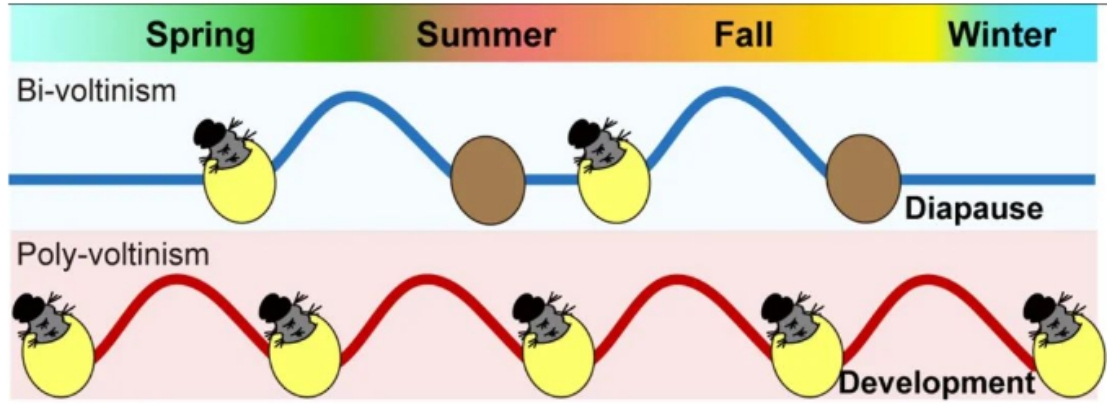 (蓝色:二化,即通过胚胎滞育一年繁殖2代;红色:多化,一年多代)