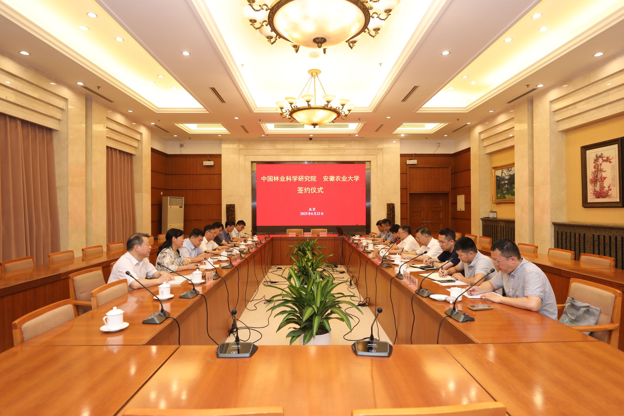 本网讯 多年携手结硕果,深化合作启新程。6月23日,校党委副书记、校长操海群率队赴中国林业科学研究院学习调研,签署战略合作协议。中国林科院院长汪阳东参加座谈会,林科院副院长王军辉和校党委常委、副校长吴祥为代表双方签约。