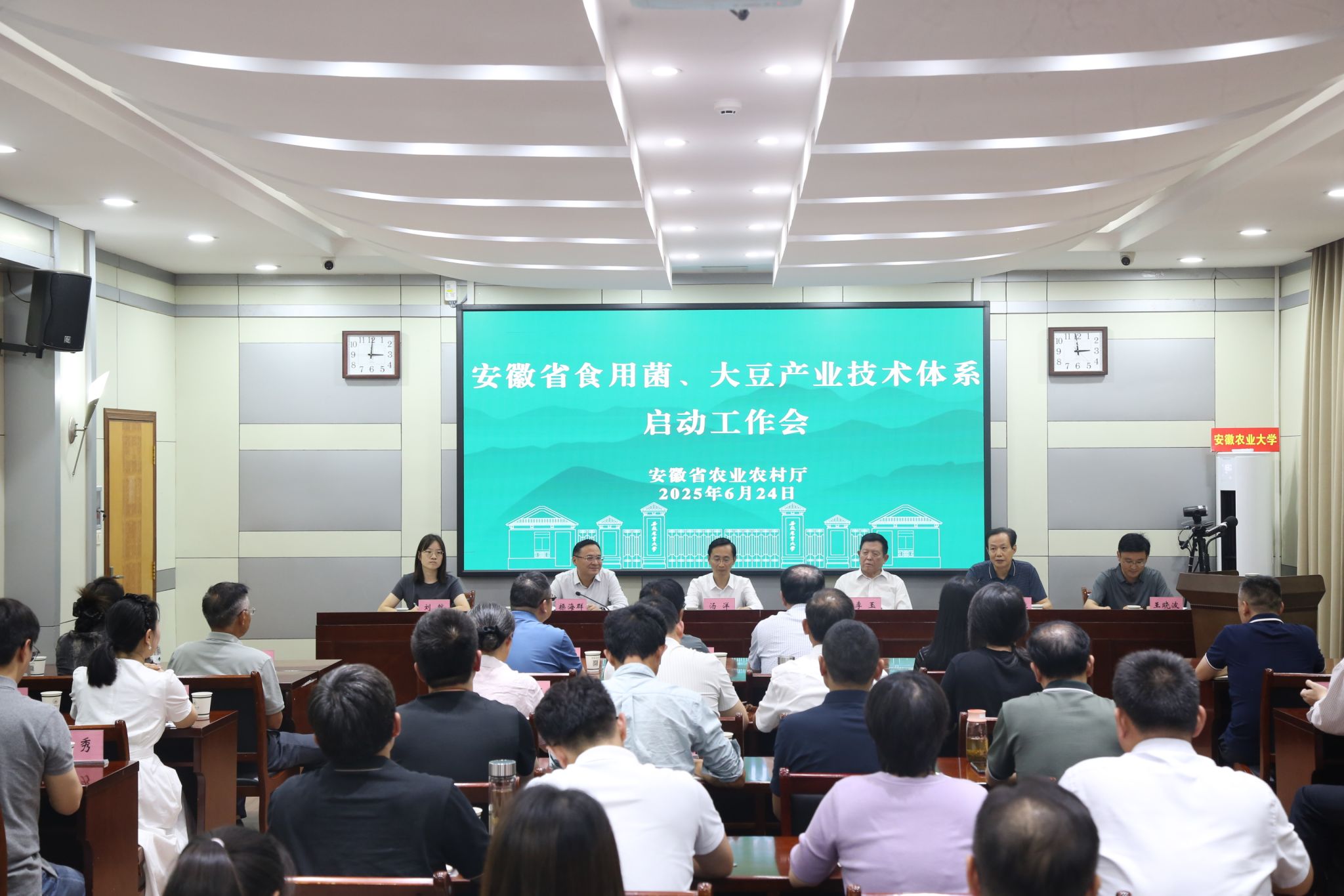 本网讯 6月24日下午,安徽省食用菌、大豆产业技术体系启动工作会议在我校召开。中国工程院院士李玉,安徽省农业农村厅副厅长汤洋,安徽农业大学党委副书记、校长操海群出席会议。省财政厅农业农村处、省农业农村厅科学技术处、计划财务处、种植业管理局乡村产业发展处等相关处室负责人,省食用菌、大豆产业体系岗站专家参加会议。