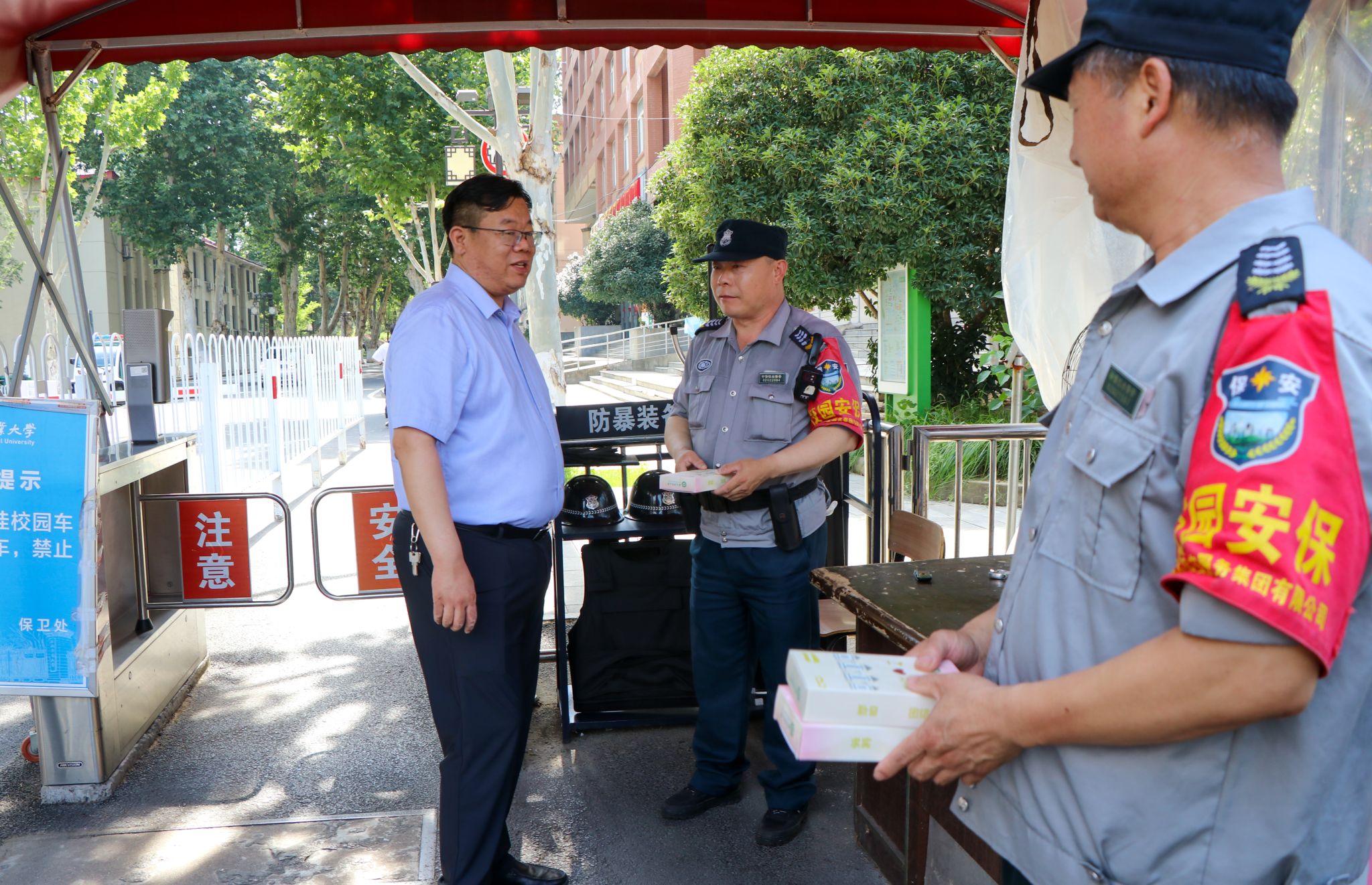 本网讯 盛夏时节,炎日如火。校友会办公室、教育基金会秘书处联合总务部、保卫处开展“清凉一‘夏’送关怀”主题慰问活动。7月2日下午,校党委常委、副校长江海洋,校教育基金会理事长裴树东将凝结着学校关怀与创意的“安农文创雪糕”送到校园门岗、宿舍、食堂等一线工作人员手中,为高温下坚守岗位的他们送上一份“夏日的清凉”。