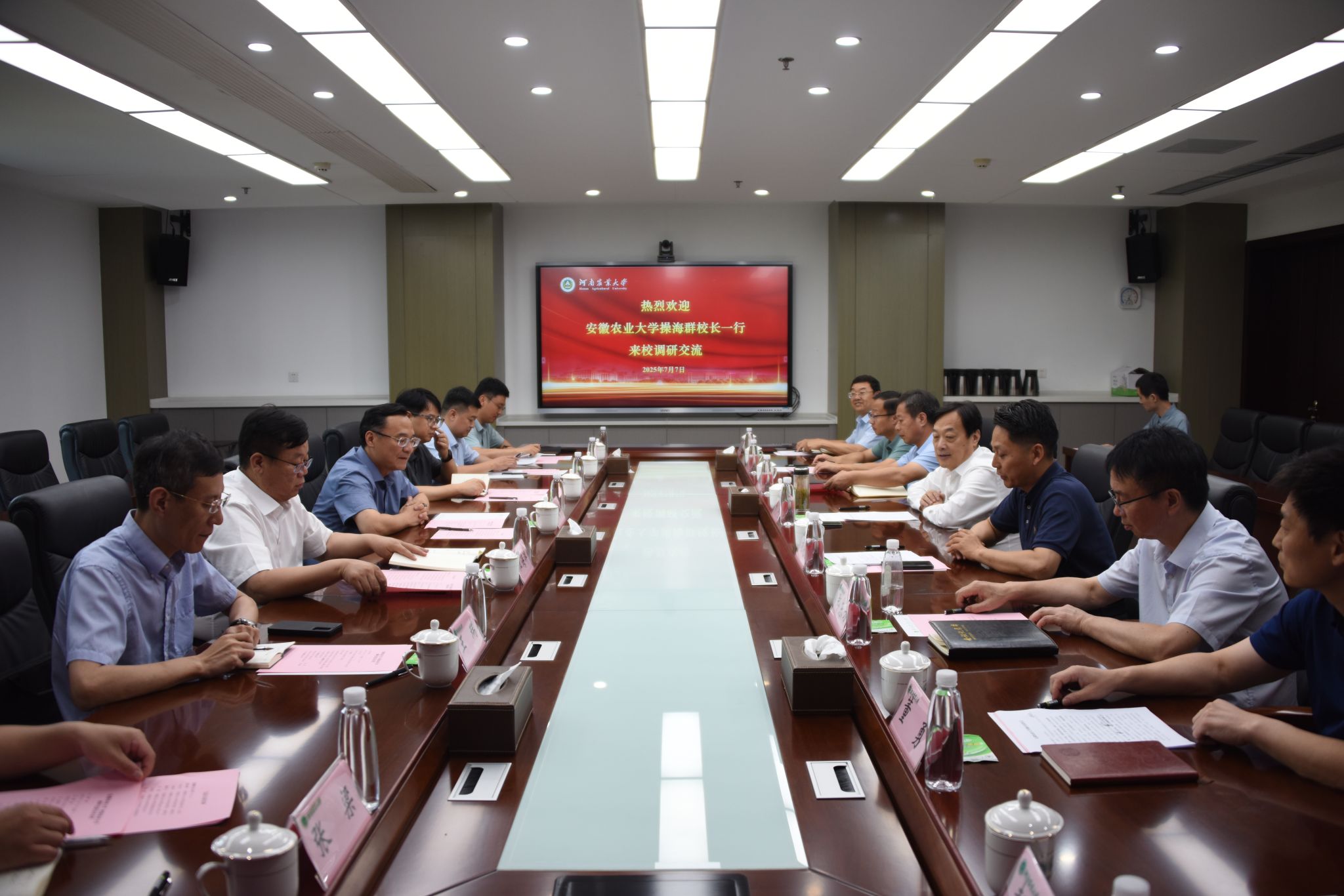 河南农业大学校长、中国工程院院士周卫,副校长刘晓永、学术副校长汤继华等参加座谈会。双方就“十五五”发展、高层次人才引培、高能级平台建设、高质量成果培育以及校园建设等进行深入交流。双方一致表示,两校地缘相近、人缘相亲、学科相通,要持续深化合作交流,共同促进两校高质量发展,携手助力乡村全面振兴和农业高等教育改革。座谈会前,操海群一行参观了小麦玉米两熟高效生产全国重点实验室、河南农大校史馆。