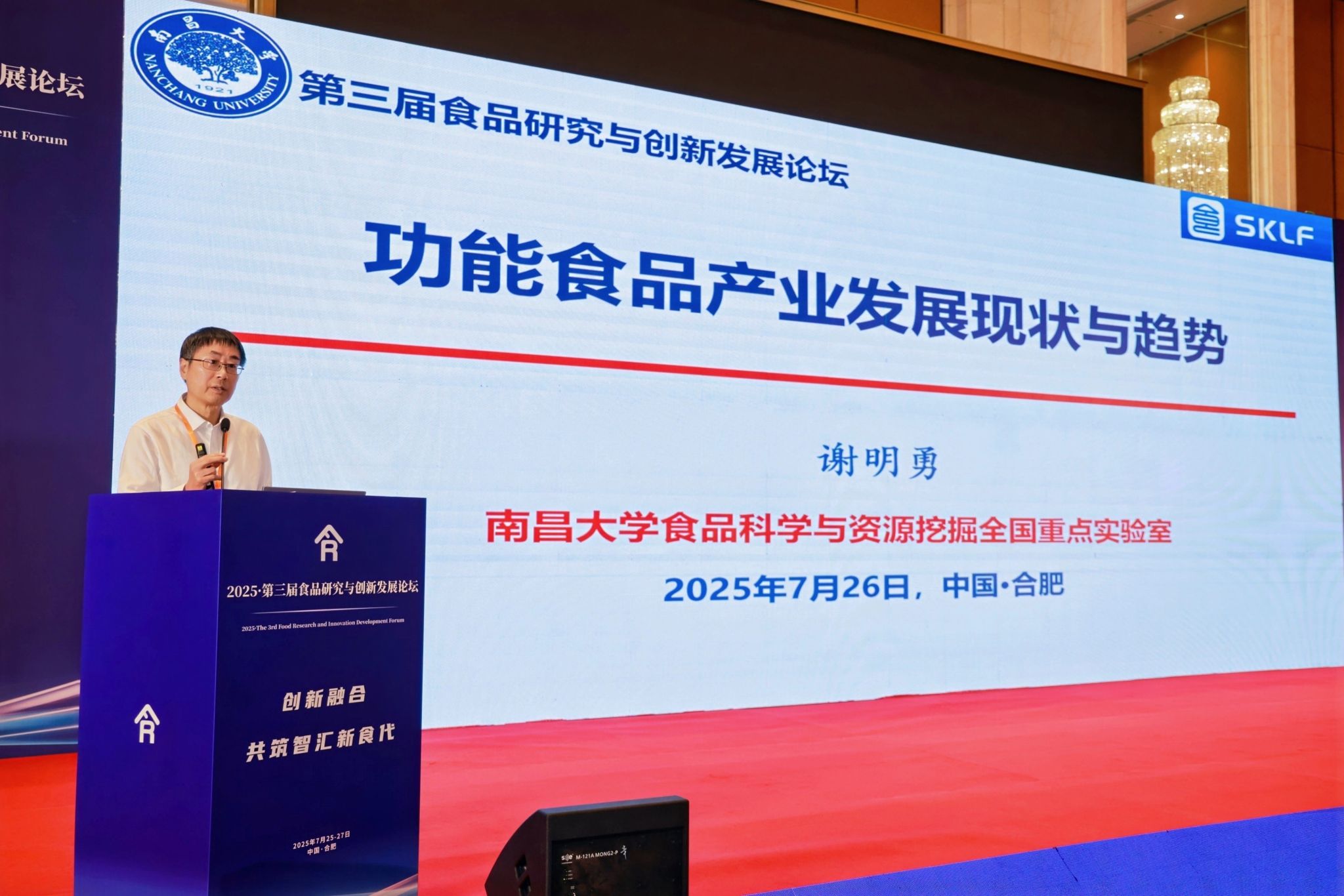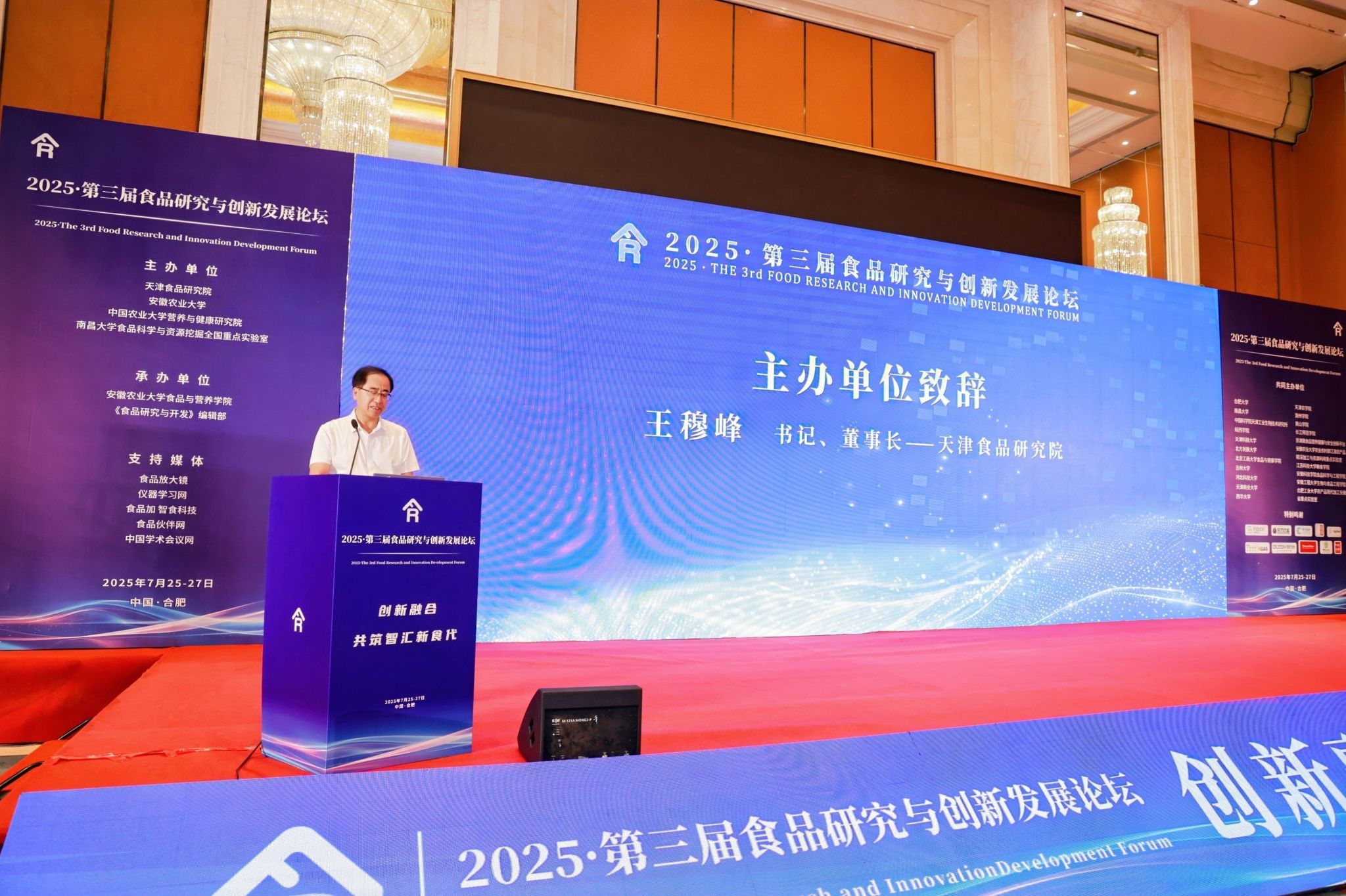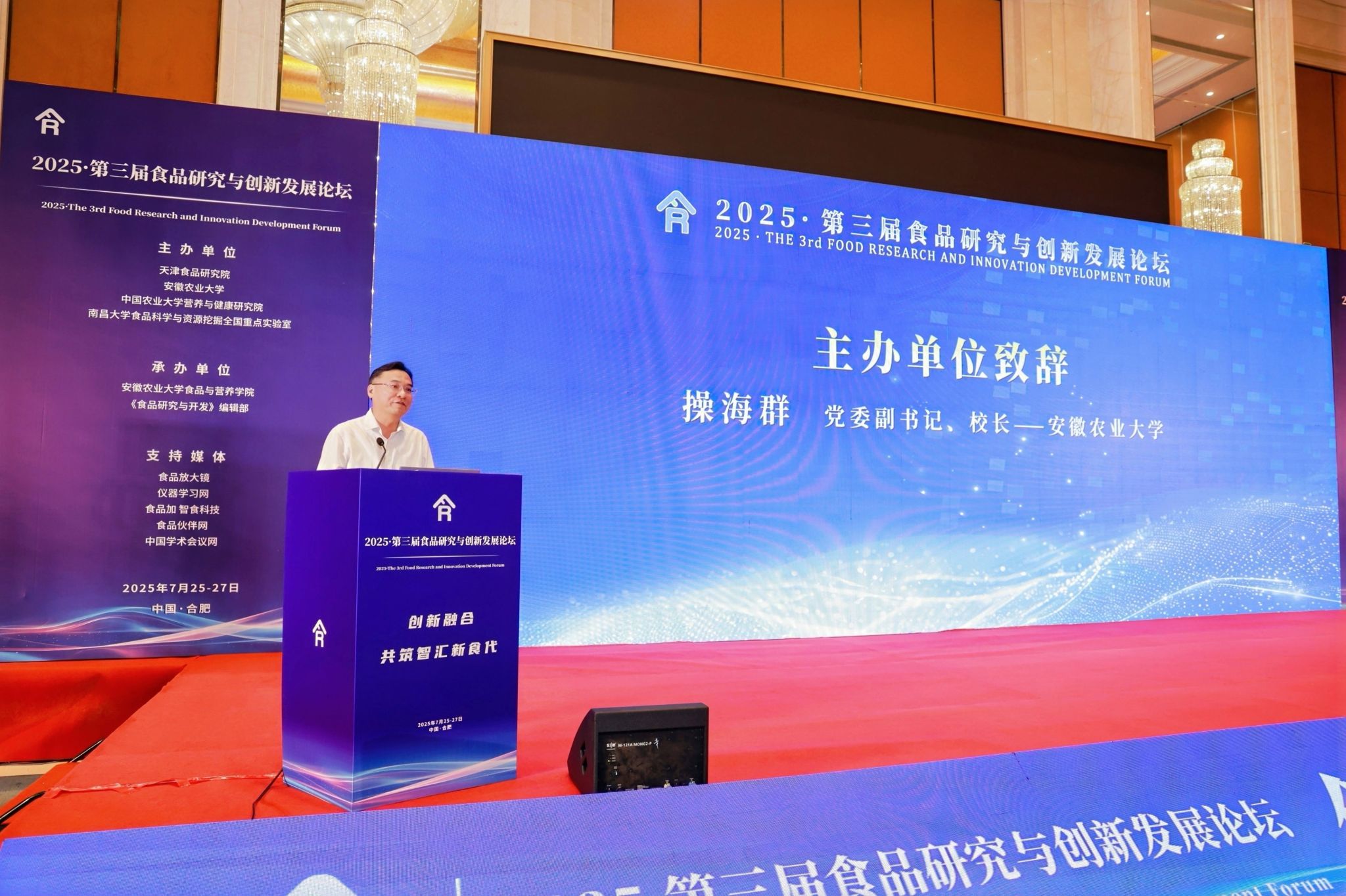 本网讯 7月25日至7月27日,由我校和天津食品研究院、中国农业大学营养与健康研究院、南昌大学食品科学与资源挖掘全国重点实验室联合主办的第三届食品研究与创新发展论坛在合肥举行。中国工程院院士任发政教授、谢明勇教授,校党委副书记、校长操海群,天津食品研究院党委书记、董事长王穆峰出席论坛。来自全国食品及相关领域高校、科研院所的专家学者及业界精英500余人参加论坛。