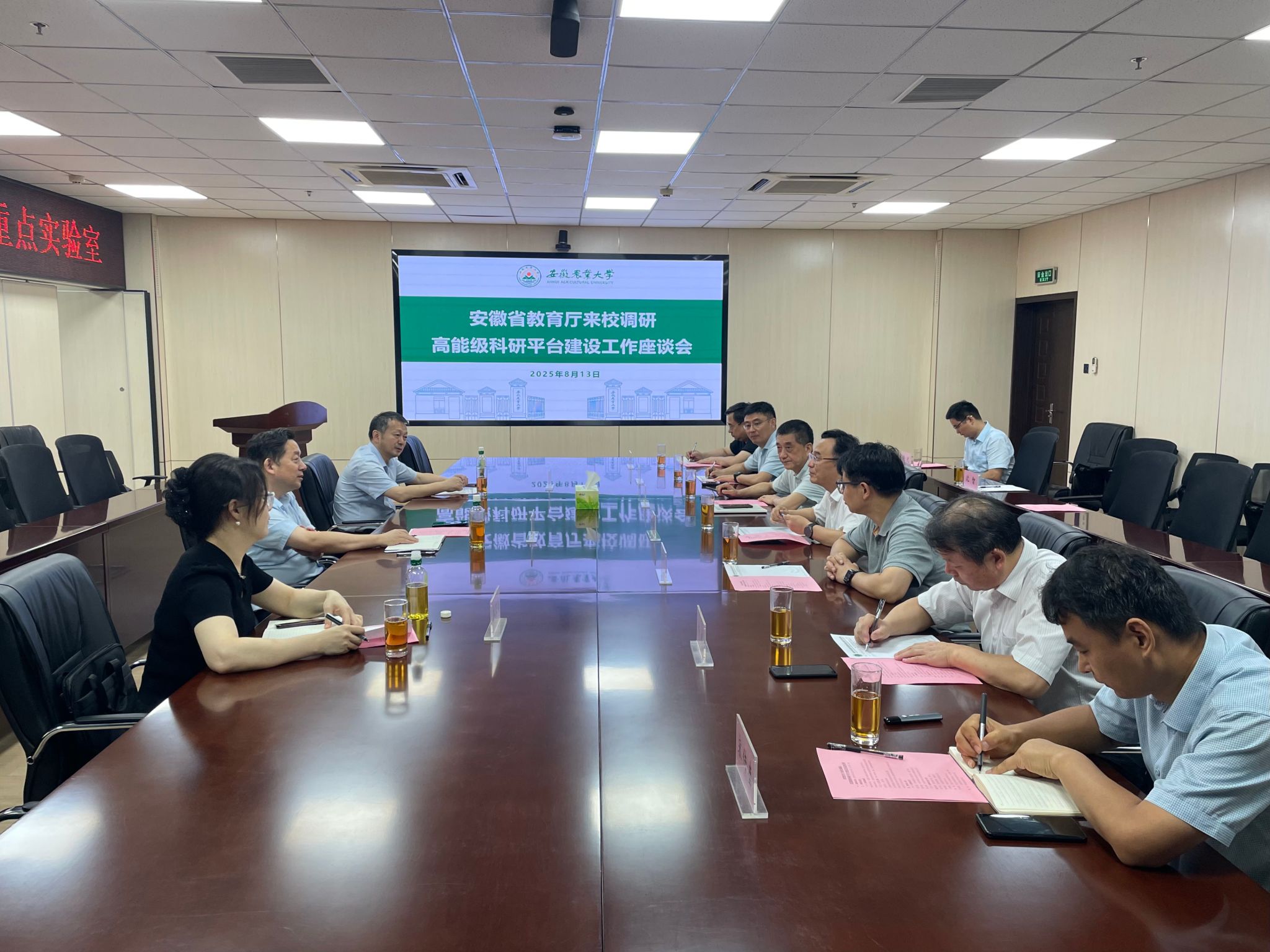 操海群代表学校对刘业勋一行表示热烈欢迎,对省教育厅长期以来给予学校的关心、指导和支持表示感谢,并介绍了我校茶树种质创新与资源利用全国重点实验室等高能级科研平台建设情况。他强调,高能级科研平台是突破科学前沿与关键核心技术、培育高层次人才、促进学科建设与交叉融合的重要载体,对推动学校高质量发展具有核心支撑作用。学校将持续加强高能级科研平台建设,在平台管理、资源配置、人才引培等方面加大支持力度。