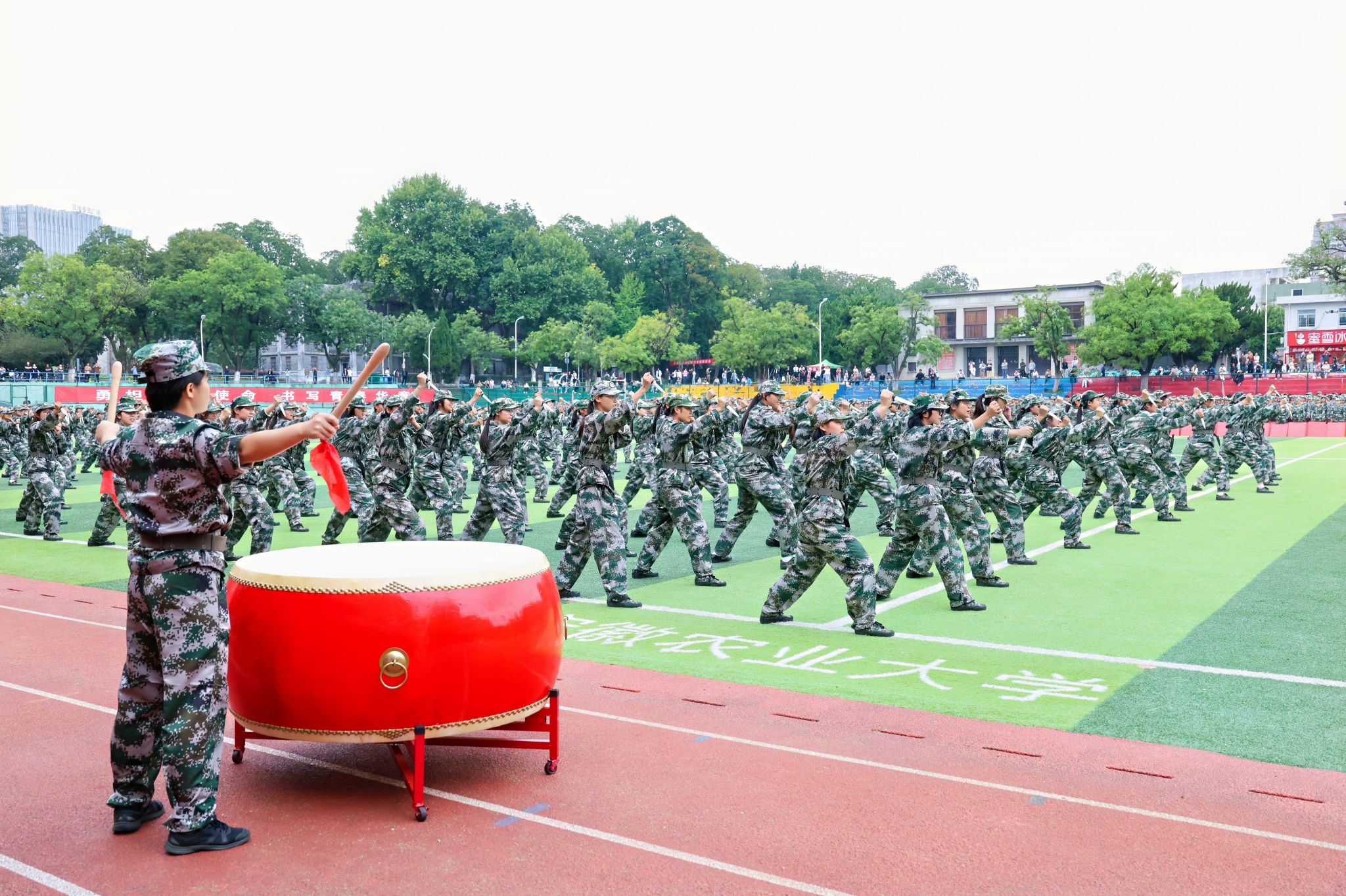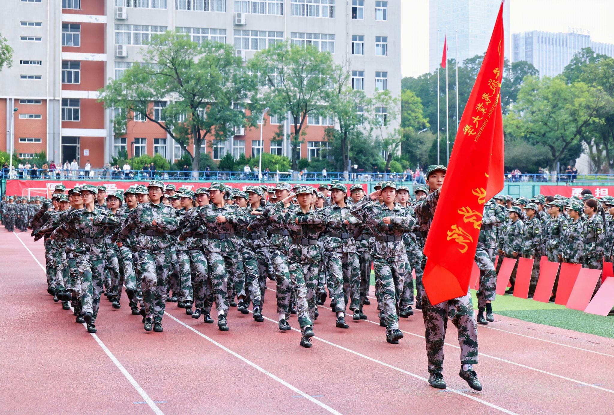 5400余名新生接受了检阅,他们身着整齐的迷彩服,以挺拔的身姿、铿锵的步伐展现出2025级新生经过军训磨砺后的良好精神风貌与过硬纪律作风。在“军训内务”评比中,外国语学院荣获一等奖,人文社会科学学院、工学院荣获二等奖,动物科技学院、经济管理学院、林学与园林学院、茶业学院、园艺学院荣获三等奖;在“军训优秀队列”评比中,材料与化学学院荣获一等奖,工学院、人文社会科学学院荣获二等奖,茶业学院、动物科技学院、资源与环境学院、信息与人工智能学院、植物保护学院荣获三等奖。大会还对获评的9名军训优秀辅导员、112名军训学生标兵、11个标兵宿舍、17个优秀宿舍进行了表彰。