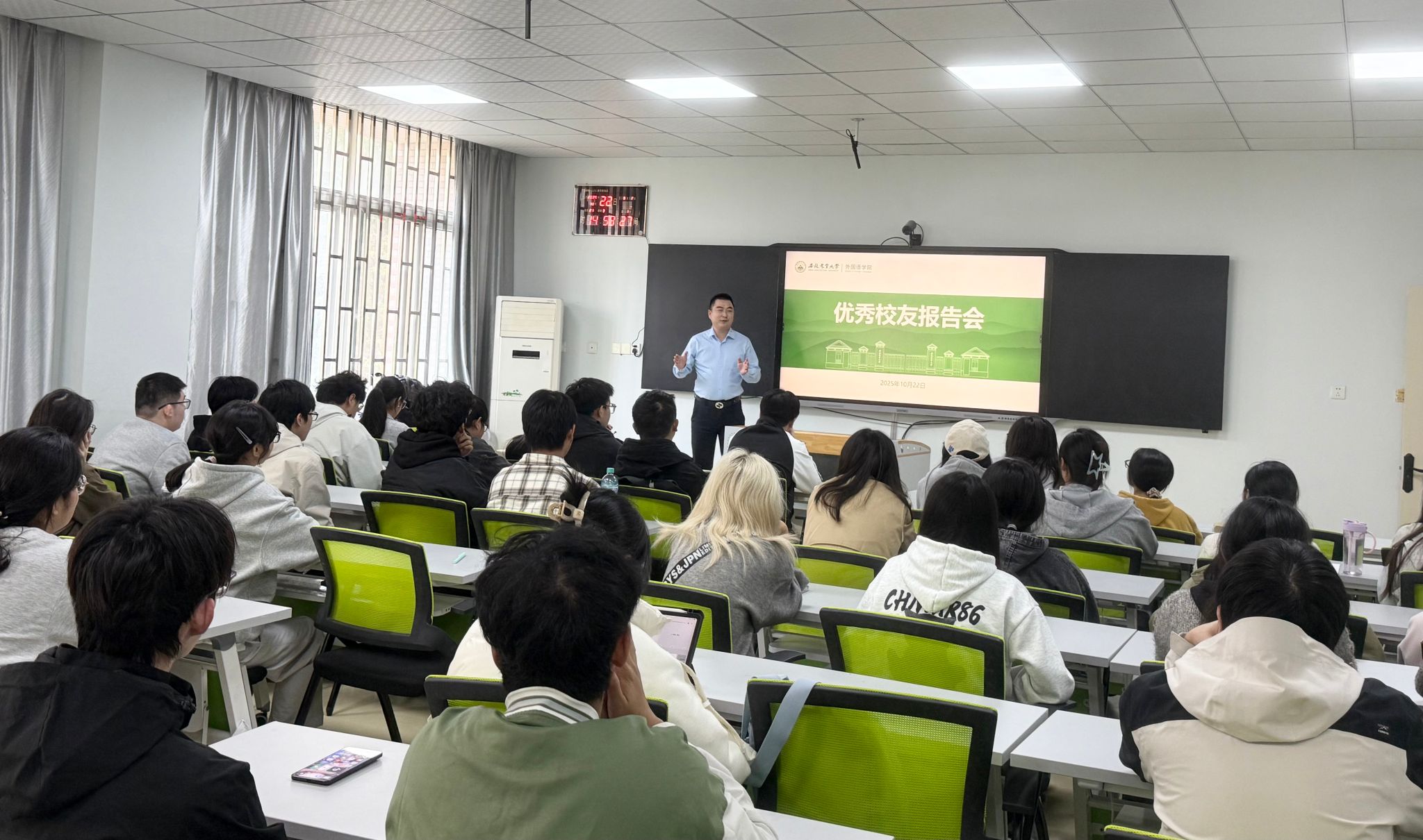 本网讯 10月22日下午,外国语学院在外语楼209教室举办优秀校友报告会暨校友企业专场宣讲会,宁波索能贸易有限公司、苏州艾尼维尔电气有限公司总经理潘江涛(2013届英语专业校友)、外贸专员姜虹翼(2025届英语专业校友)、外国语学院党委副书记姬惠惠、2026届部分毕业生等参加了会议。