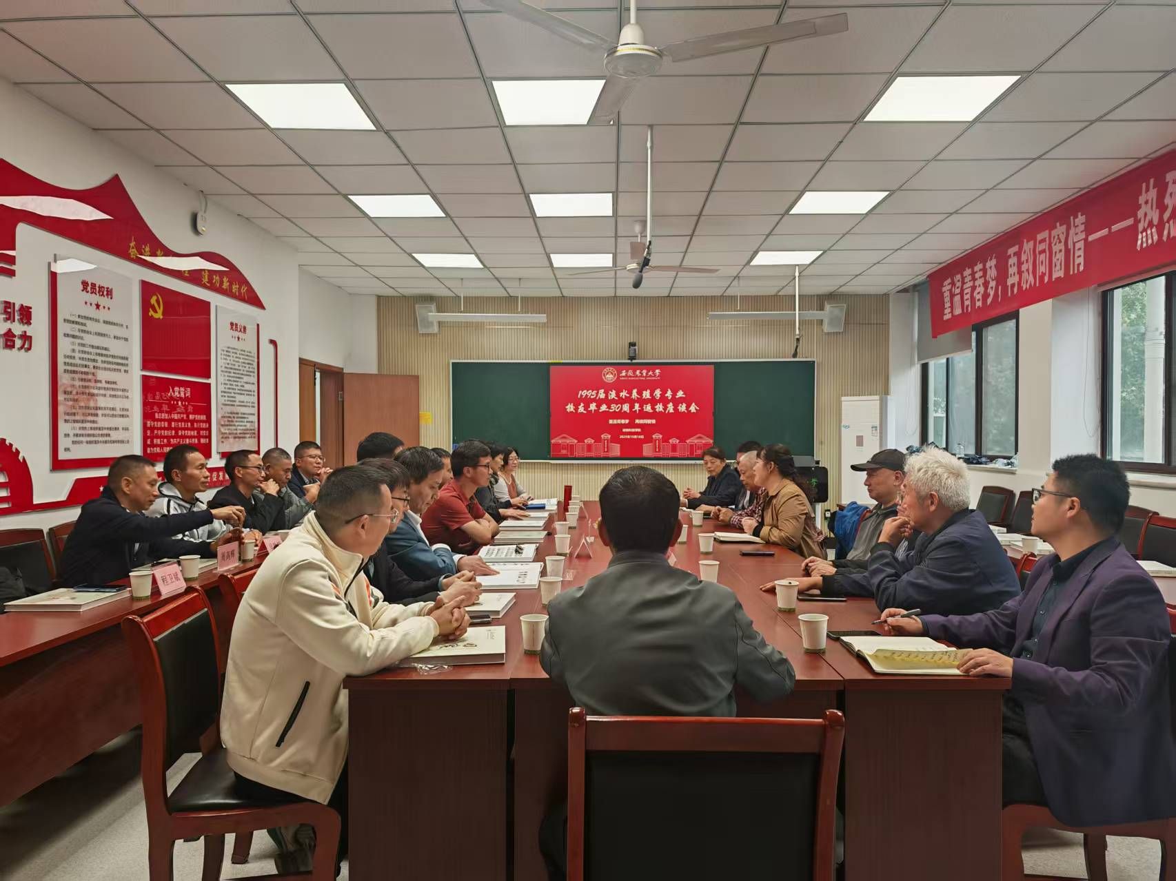 本网讯 秋光叠彩,映三十载同窗旧影;澄空送远,载半生故友重逢心。10月18日下午,学院召开“重温青春梦,再续旧窗情”1995届淡水养殖学专业校友毕业30周年座谈会。校教育基金会秘书长刘惠东,学院党委书记沈兆梅、党委副书记卢伟、副院长袁小琛、水产系主任张云龙、时任专业课教师代表等与校友们欢聚畅谈,回望青葱岁月,共叙师生情谊。