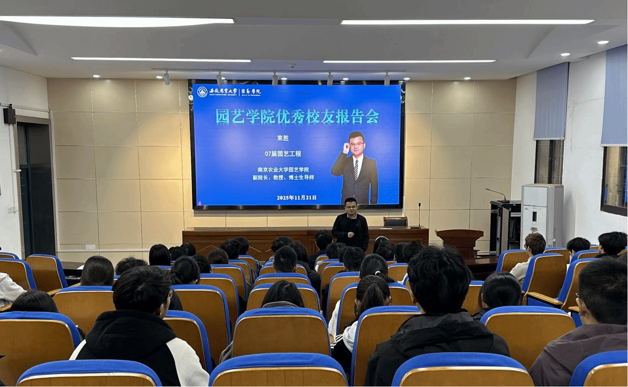 本网讯 为充分展示优秀校友的风采,助力新生明确职业方向,增强专业认同感与职业使命感,11月21日下午,学院邀请了2007届园艺工程毕业生、南京农业大学园艺学院副院长、教授、博士生导师束胜,来校做“对话·成长”优秀校友报告会。2025级园艺6班、7班、8班的同学们参加报告会,会议由学院党委副书记、纪委书记叶辉主持。