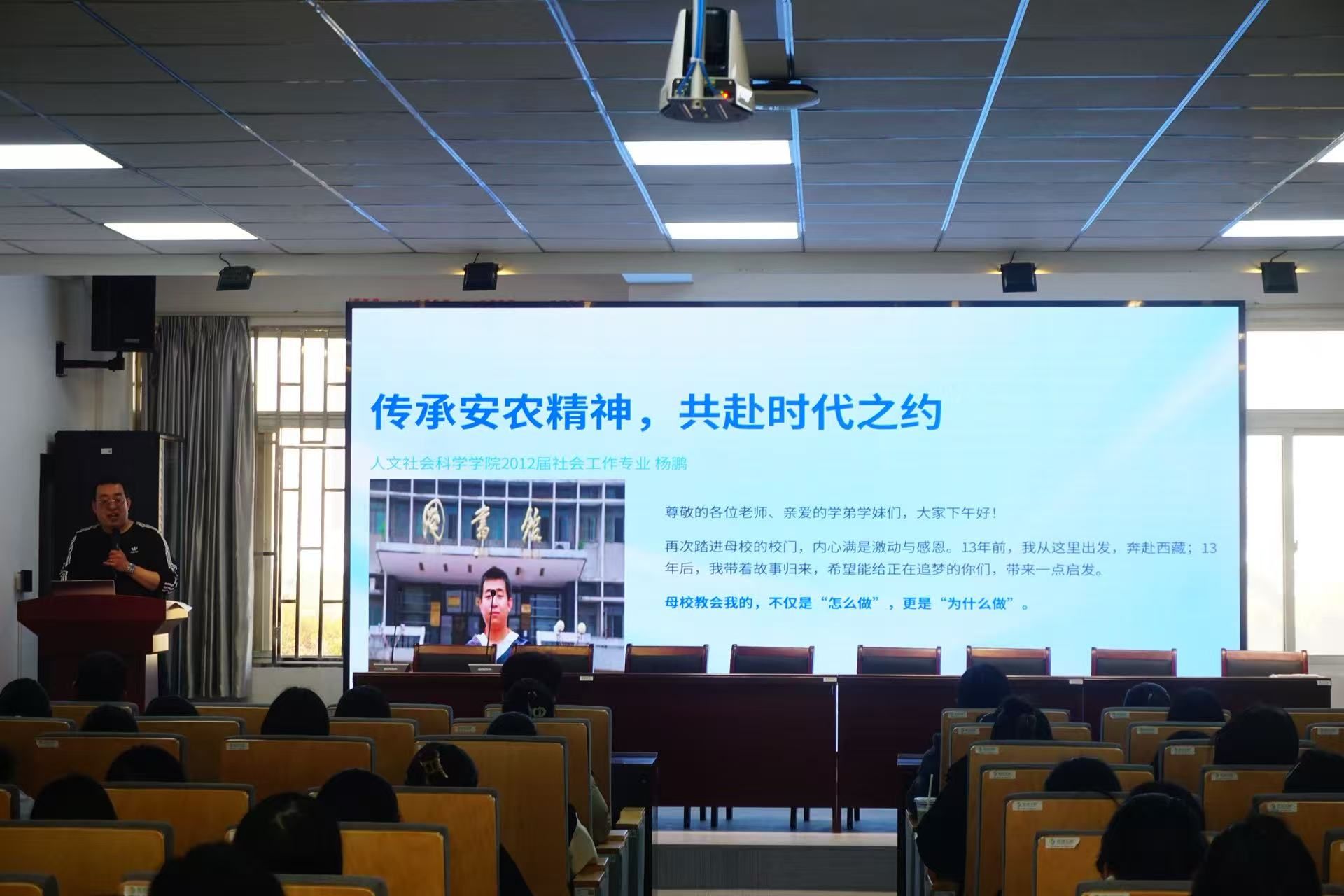 本网讯 11月30日,由校团委主办、人文社会科学学院承办的学校第二期“青春对话榜样人物”主题讲座在人文楼602报告厅举办。此次活动特邀共青团西藏日喀则市委员会办公室主任、我校2012届社会工作专业校友杨鹏,与在场师生分享他扎根祖国边疆十三载的奋斗历程与青春感悟。校团委、人文社会科学学院有关负责人以及110余名学生参与此次讲座,现场气氛热烈。
