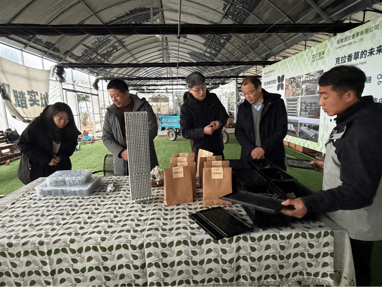 芳香四溢的育人土壤。在安徽克拉香草有限公司,我们仿佛步入一片芬芳的童话世界。薰衣草、迷迭香、洋甘菊……各式香草在大棚里茁壮成长,这是我校2000届园艺专业校友、涡阳县科技局常务副局长蒋清源指导的项目成果。企业负责人如数家珍:“亳州有深厚的中药材底蕴,我们正把传统优势转化为现代芳香产业。”从种植养护到精油提取,从产品研发到文旅融合,每个环节都需要园艺、设施农业、农产品加工等专业人才。随行人员表示:“我们的学生有扎实的理论功底,缺的就是这样的产业一线课堂。”双方商定,深入合作,共建安徽农业大学就业实习实践基地,让课堂延伸到田间地头。
