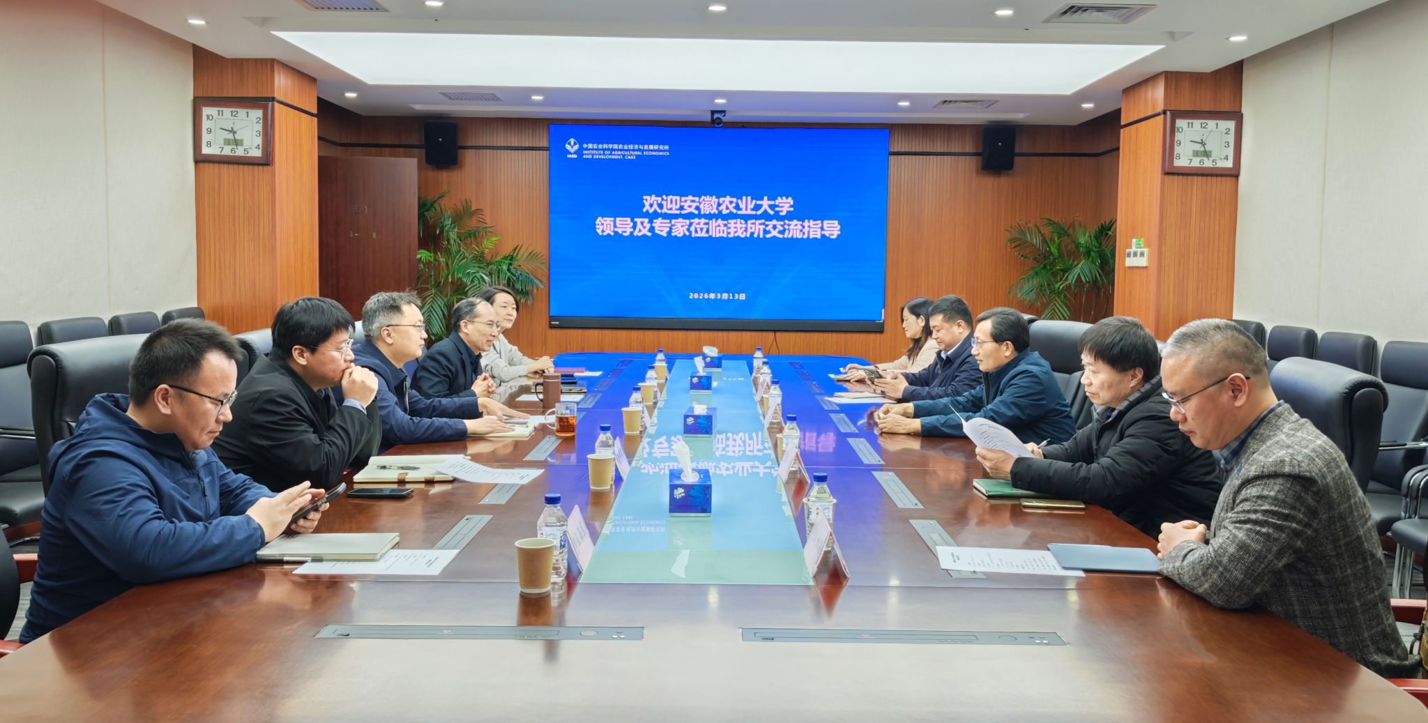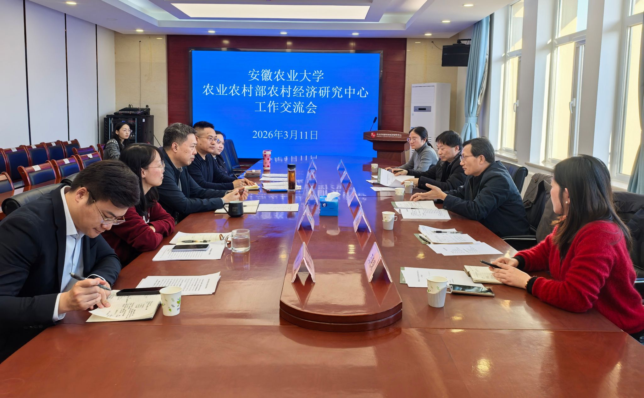 在农研中心,双方重点就人才联合培养、数据资源开发利用、高质量研究成果培育等进行座谈。在农经所,双方聚焦落实“1+5”农业科技创新联盟工作、江淮中心建设、学术期刊发展等细化合作事项。参加座谈的领导和专家们一致认为,安徽是中国农村改革发源地,地处南北气候过渡带,地形地貌多样,科创动能强劲,是农业科技创新的“试验田”,是农村改革研究的“经典样本”;一致表示希望与安徽农大深化合作,重点围绕粮食安全、乡村产业振兴、乡村建设、农村改革等领域,协同开展前瞻性、战略性研究,联合培养农业拔尖创新人才,共同服务乡村全面振兴和江淮粮仓建设。