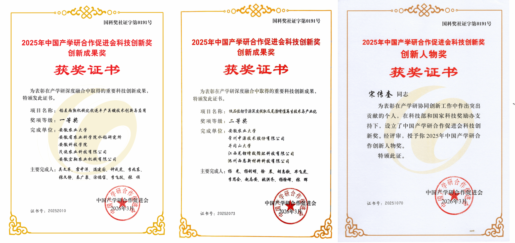 吴文革教授牵头完成的“稻麦两熟机械化抗逆丰产关键技术创新与应用”荣获创新成果奖一等奖,杨光教授牵头完成的“低品位锂资源深度提取及尾渣增值再生技术及产业化”荣获创新成果奖二等奖,宋传奎教授荣获创新人物奖。