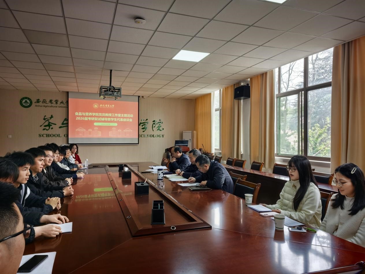 本网讯 为精准助力考研学子做好复试准备,3月23日下午,食品与营养学院在茶业楼219会议室举办党员教授工作室主题活动——2026届考研复试辅导暨学生代表座谈会。学院党委书记孙福,院长周裔彬教授,食品营养与安全系主任黄进宝教授,以及2025届优秀校友代表舒琪、许宾宾,2026届考研学生代表共同参会。