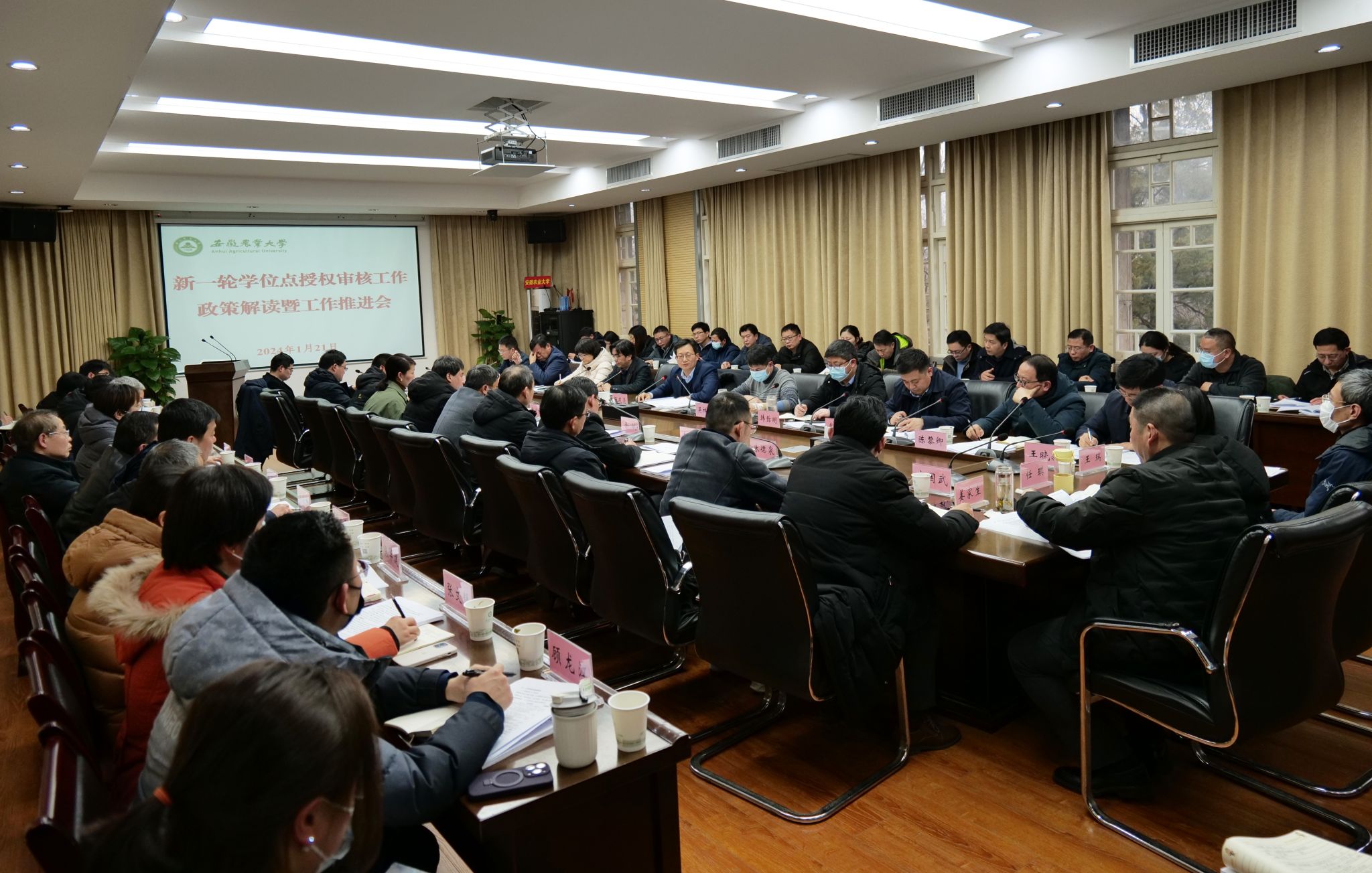 本网讯 1月21日下午,学校在第三会议室主持召开新一轮博士硕士点授权审核工作政策解读暨工作推进会,校党委书记张庆亮主持会议。校党委常委、副校长吴祥为,相关职能部门负责人、各学院党委书记、院长、相关申报点学科负责人及材料执笔人参加会议。