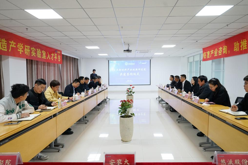 本网讯 12月8日上午,我校与安徽绿能技术研究院有限公司、芜湖悠派护理用品科技股份有限公司共建“医卫新材料产业创新研究院”签约仪式在绿能院会议室圆满举行。校党委书记张庆亮出席会议并讲话。绿能院院长昝向明、悠派股份董事长兼总经理程岗分别致辞。校党政办公室、信息化办公室,社会合作处、新农村发展研究院,材料与化学学院等单位负责人和相关学科负责人参加签约仪式和座谈会。
