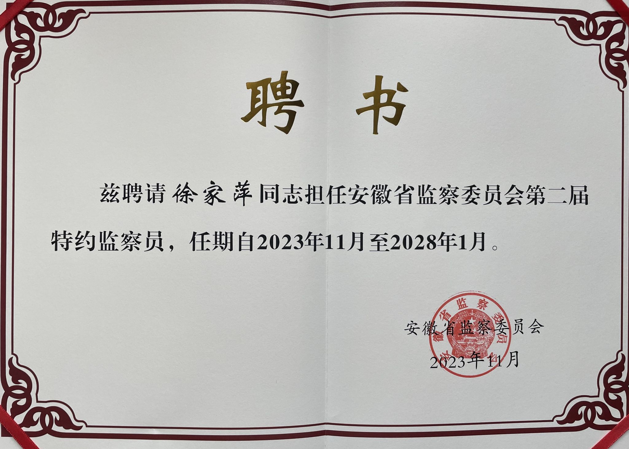 本网讯 近期,省监委发布《安徽省监察委员会关于聘请第二届特约监察员的决定》。11月16日,省监委召开第二届特约监察员聘请会议,优选聘请24名特约监察员。省委常委、省纪委书记、省监委主任刘海泉为特约监察员颁发聘书并讲话。我校徐家萍研究员获聘。