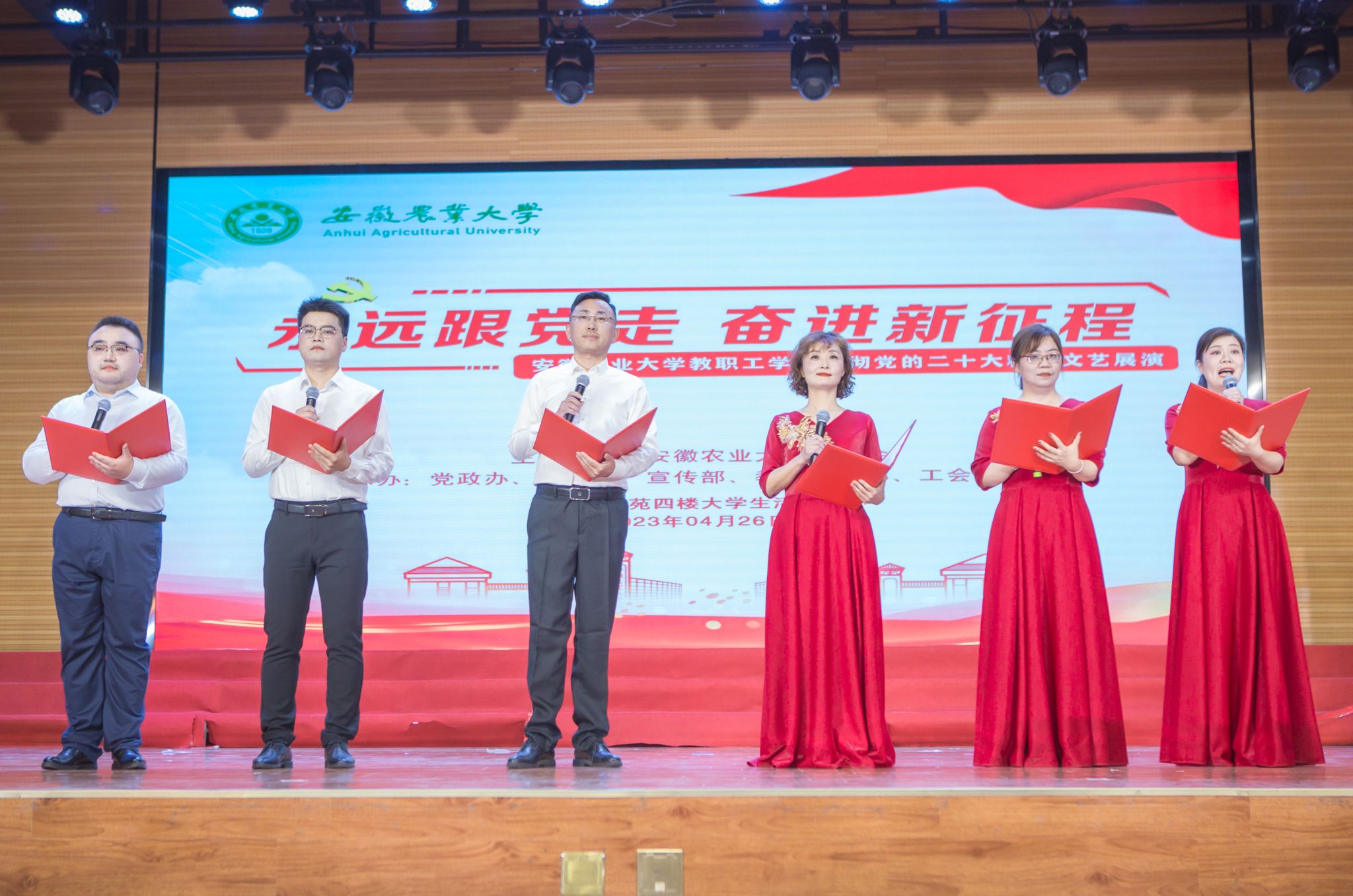 本网讯 4月26日晚,我校“永远跟党走 奋进新征程”教职工学习贯彻党的二十大精神文艺展演在欣苑四楼大学生活动中心举行。校领导裴树东、李红、马传喜、韩军、陈文兵出席活动。