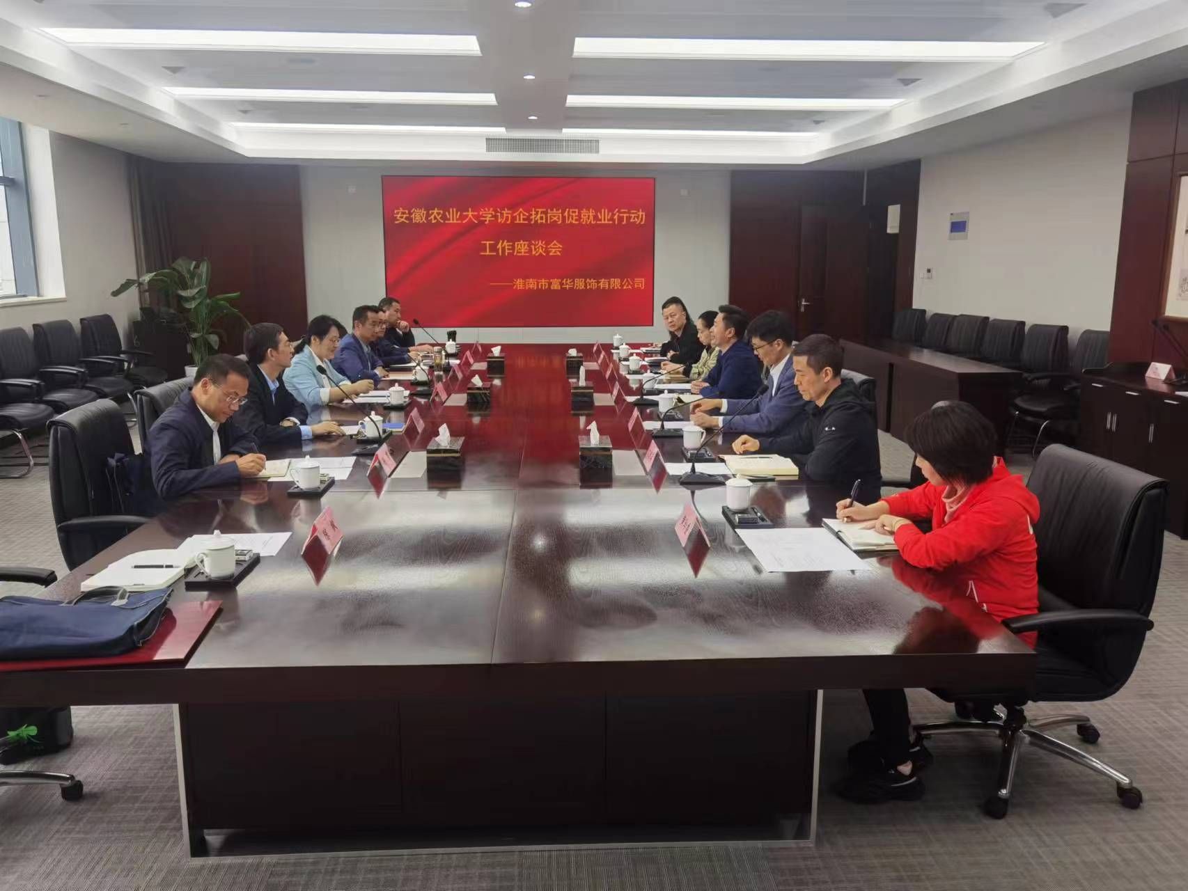刘成军对李红一行来访表示热烈欢迎,他介绍了大通区基本情况,并对安徽农业大学长期以来对大通区各项事业发展的大力支持表示感谢。文继兵详细介绍了富华服饰的发展现状、未来愿景及人才需求情况,并希望能与学校进一步开展更深入的校企合作,促进企业更高质量发展。