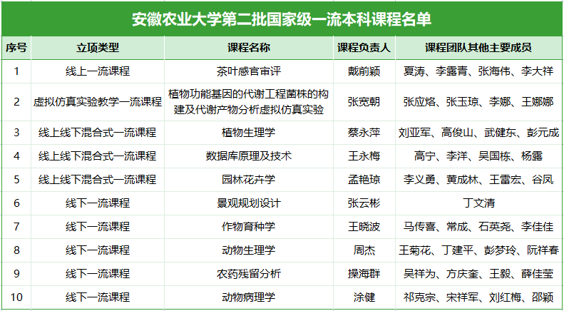 国家级一流本科课程是教育部推进一流课程“双万计划”和一流专业“双万计划”实施,推动新工科、新医科、新农科、新文科建设的首要任务和重要抓手。2019年10月,教育部发布了《关于一流本科课程建设的实施意见》,表示将在三年左右时间建成万门左右国家级和万门左右省级一流本科课程。以此为契机,学校将一流本科课程建设作为提升本科教学质量和发展水平的核心要素,制订并发布了《安徽农业大学关于一流课程建设的指导意见》,大力推动本科课程的内涵性建设和高质量发展。
