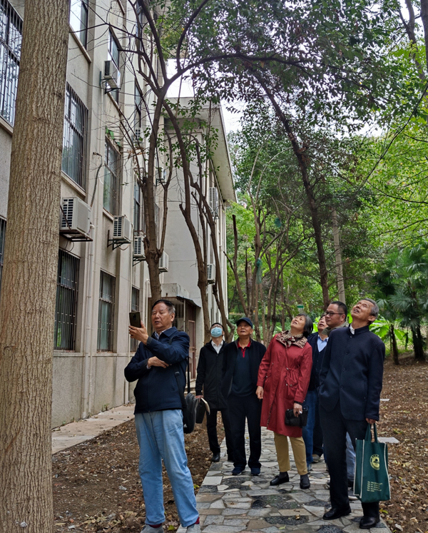老同志们边听边看、边聊边议,忆峥嵘岁月、谈今日变化,看林木叠翠、议提升提质。老同志们说,勤政楼前后的一草一木、一砖一瓦,镌刻着农大的历史和文化,浓缩了农大人的记忆和骄傲,是花园式校园的精华和核心,记忆中一直没有彻底修剪过、整理过。前人栽树、后人修剪,通过彻底修剪校园更加通透、更加明亮、更加空灵,更加方便师生亲树亲绿,更加适合阳光雨露滋养林下绿植,彻底还清了“历史的欠账”。老同志们建议,要打造“宜人小景点”,让师生可亲可近。要结合师生需求,在整体规划的基础上,因地制宜,打造若干精致“小景点”、慢生活“小园”,方便师生工作学习之余休憩休闲、交流研讨、静坐闲聊,逐步实现路在树下、人在林中、满眼皆绿、可走可坐,一步一景、移步换景、景中有景的校园景观。要延续“农大原品格”,让校友找到记忆。要延续农大传统特色风貌,传承农大原有底蕴内涵,突出农耕文化特质气质,在提升中延续、在提质中传承、在传承中创新。要让校友“回家”找到“符号”、唤起“记忆”、想起“故事”,同时看到新变化、感悟到“小确信”,逐步打造 “抬头看树、低头赏景”,人景相融、景人相宜,静美恬适的校园风貌。要丰富“楼廊树文化”,让环境育人有载体。要让各栋楼宇、墙廊柱、树花草等灵动起来,植入文化意念、思政元素、“农耕”思想、“大别山道路”精神等内涵,使校园园林景观、文化景观、人文景观互动互补互溶,让他们既有“颜值”,也有树人育人化人价值,更有实验实习价值,努力打造四季有花、每季有果,时时、事事、处处育人的校园氛围。
