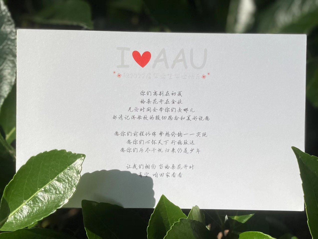 印有”I Love AAU”的专属防疫口罩仿佛在提醒着毕业生,请不要忘记我们一同共克时艰、守望相助的安农岁月,未来的路也有母校在守护。
