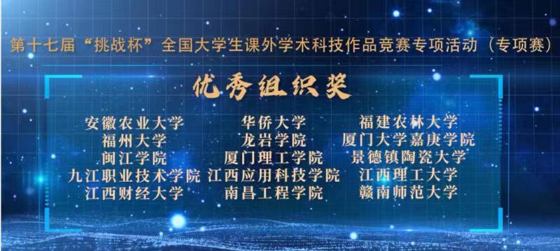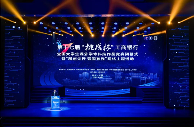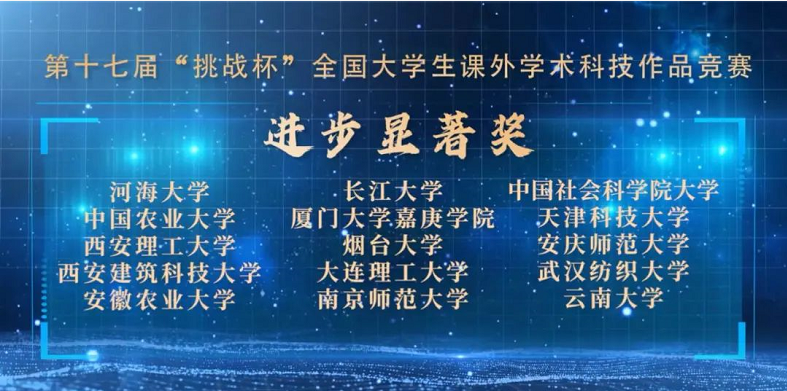 4月12日,由共青团中央、中国科协、教育部、中国社会科学院、全国学联、四川省政府共同主办,四川大学承办的第十七届“挑战杯”全国大学生课外学术科技作品竞赛闭幕式暨“科创先行 强国有我”网络主题活动举办。团中央书记处书记傅振邦,四川省副省长杨兴平,全国评审委员会主任、中国科学院院士袁亚湘,四川大学党委书记王建国、校长李言荣出席。我校荣获第十七届“挑战杯”竞赛进步显著奖和专项活动优秀组织奖,其中,校级“进步显著奖”全国仅15个。