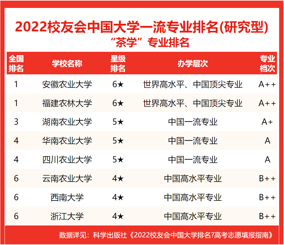 榜单显示,在最新校友会2022中国大学茶学专业排名(研究型)中,安徽农业大学(6★,A++)福建农林大学(6★,A++)综合实力排名最高,办学水平最高,雄居2022校友会中国大学茶学专业排名(研究型)第一。