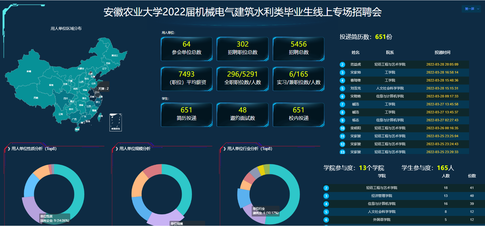 精心组织、搭建平台,就业信息保通畅。为保障毕业生就业信息全方位通畅,学校充分利用就业信息化平台,不断完善常态化“线上+线下”立体就业服务体系,依托安徽省大中专毕业生就业信息平台、安徽农业大学就业信息网和“安农就业”微信公众号等平台。广泛收集人才招聘网站、网络专场招聘,党政机关、事业单位、国有企业等高校毕业生的政策性岗位,以及其他重点领域、重要行业等招聘信息,按照毕业生专业情况和就业意愿,精准推送就业信息,保疫情防控期间招聘信息不中断,就业服务不中断。截至目前,已有2800余家单位入驻我校2022届毕业生招聘服务平台,发布岗位需求数14000多个,涵盖互联网、金融、文法、农林、生物、机械工程等多个领域。