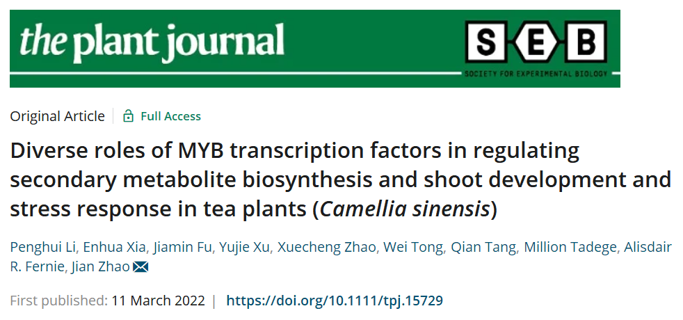 本网讯 近日,我校茶树生物学与资源利用国家重点实验室赵剑课题组在国际期刊《植物学杂志》上发表题为《MYB转录因子家族参与茶树次生代谢和叶片发育以及胁迫响应的分子机制》(Diverse roles of MYB transcription factors in regulating secondary metabolite biosynthesis and shoot development and stress response in tea plants (Camellia sinensis))的研究论文,系统研究了MYB转录因子家族参与茶树几种特征性次生代谢物合成调控、茶树幼叶嫩茎发育,及对逆境胁迫响应的调控过程的部分分子机制。