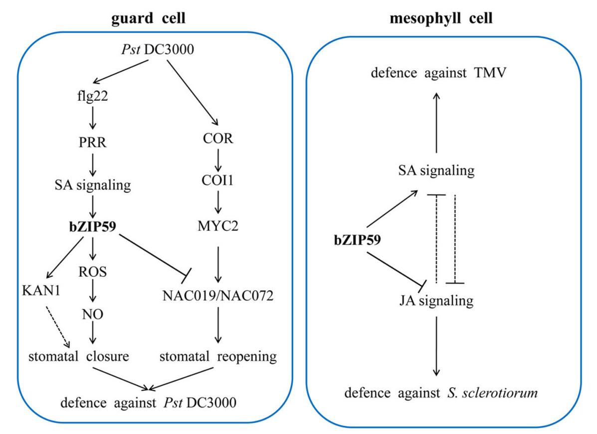 进一步解析发现,bZIP59调控的气孔关闭与细菌鞭毛蛋白flg22相关,在flg22诱导的气孔关闭中作用于ROS和NO的上游以及SA信号的下游。此外,bzip59突变体对核盘菌表现抗病,而对烟草花叶病毒表现感病,这与RNA-seq结果显示bzip59突变体中激活JA信号通路并抑制SA信号通路相关(图2)。利用ChIP-seq和EMSA实验发现,bZIP59不仅可以与包含典型ACGT核心序列的Atf1和Atf7基序结合,还可以与新的KAN1基序结合,提示bZIP59参与flg22诱导的气孔关闭可能是通过与KAN1基序结合来实现的。上述结果表明,bZIP59在拟南芥对Pst DC3000的气孔免疫中起重要作用,同时也揭示了转录因子可正向和负向调节对不同病原物的抗性。